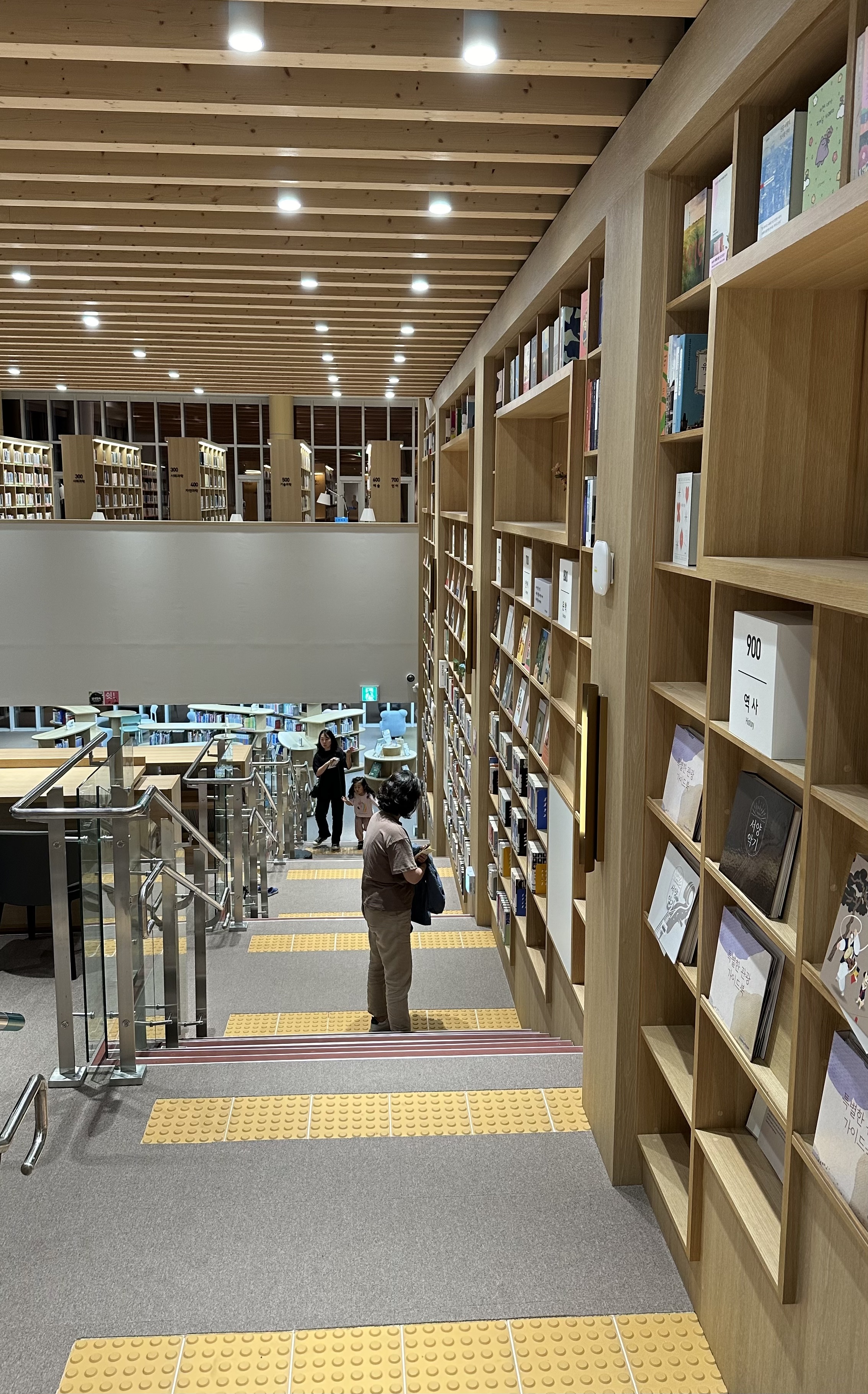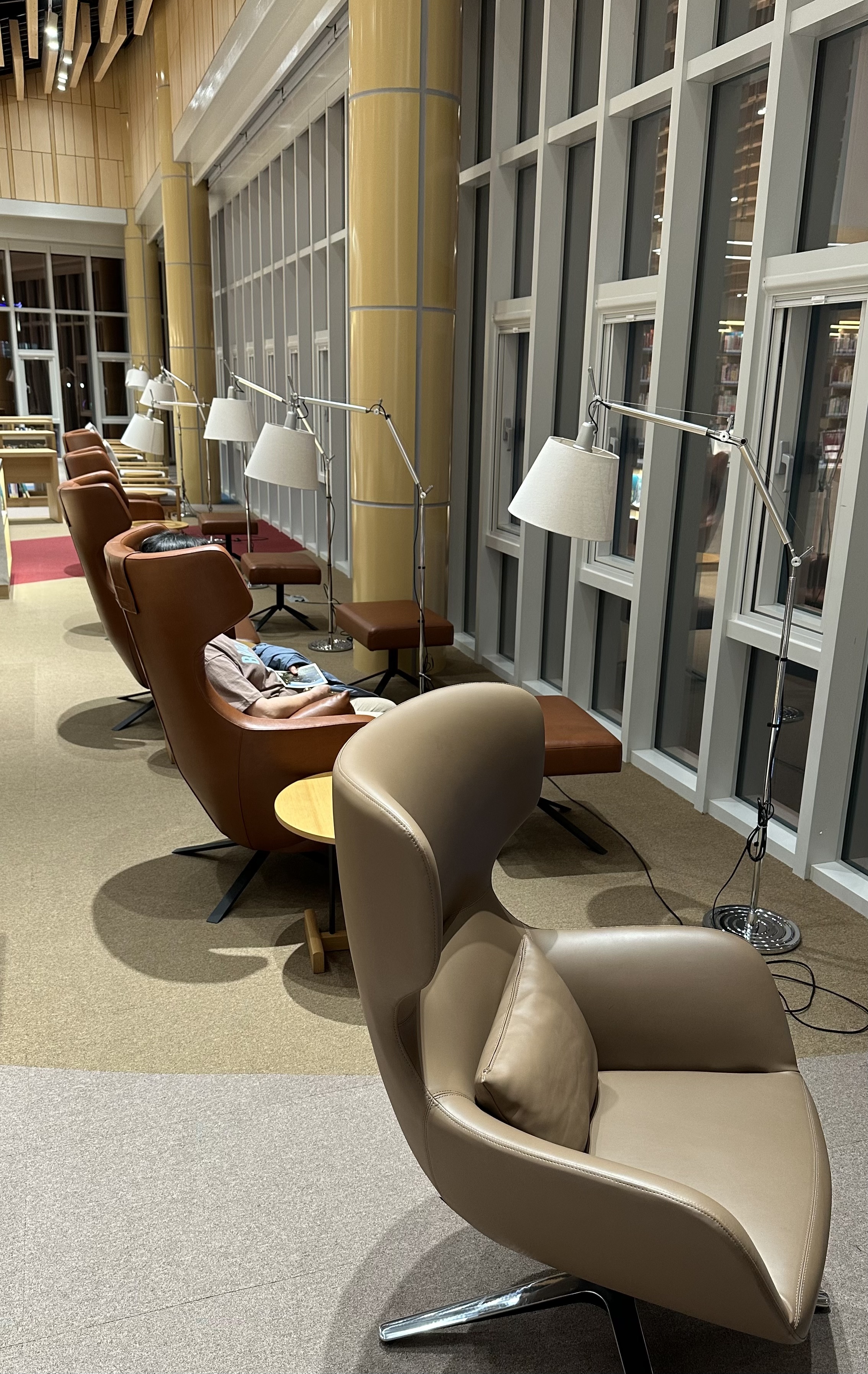 엘리베이터로 오르내릴 수도 있지만, 계단으로 오르내리는 동안에도 한쪽 면에 주제별로 큐레이션된 책들이 꽂혀 있어 걸음을 멈추고 하나하나 살펴보게 하고 있었다. 가장 놀라웠던 것은, 창가에 마련된 개인 독서 공간인데, 발판과 스탠드까지 딸린 의자 세트가 매우 편하고 품위 있어 보였다. 서로 앉으려 경쟁이 치열할듯 싶었다.
