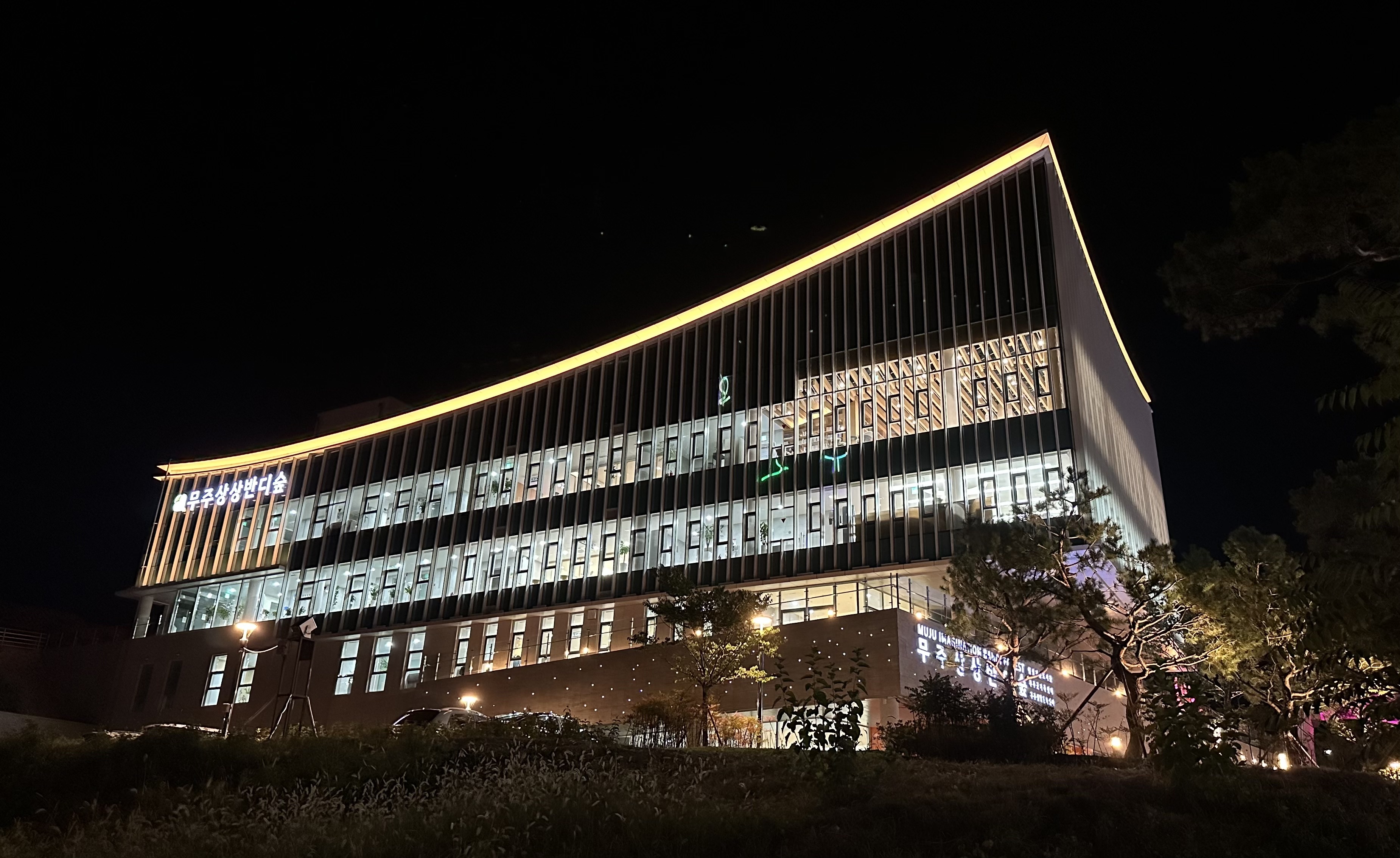 6월에 산골영화제에 다녀온 해인이가 무주에 멋진 도서관이 생겼다길래 무주에 감 김에 당연히 가려 했는데, 월요일이 휴관이라 다음에나 와야겠다 싶었다. 그런데 반딧불이 구경을 마치고 돌아와서 주차장으로 걷는데, 도서관 전체가 불을 켜고 사람들이 출입하는 게 보였다. 무주군이 축제 기간 동안 야간에도 오픈해 새 도서관을 알리는 모양이다.