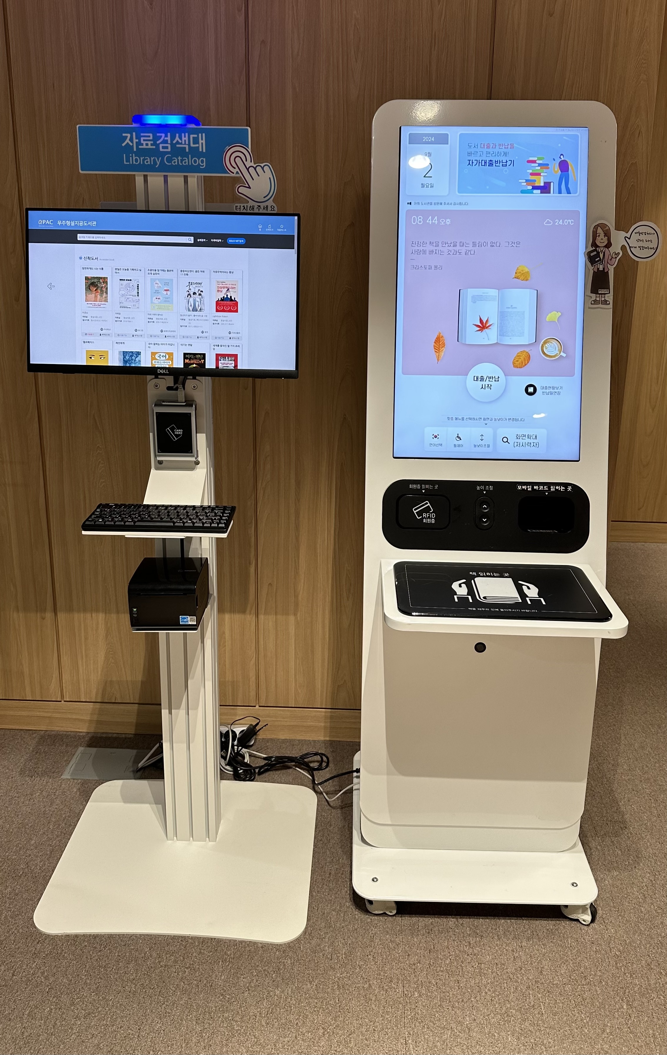 중간중간 설치된 도서 검색대와 키오스크 안내판은 자료와 정보를 제공했는데, 나오면서 직원에게 물어보니 소장 도서가 4만5천권 정도라고 한다. 무주 같은 시골에 이런 현대식 도서관이 들어서서 불을 밝히는 거야말로 주민들과 방문객들로 하여금 형설지공을 실천하고 연마하게 하는 훌륭한 투자일듯 싶다.