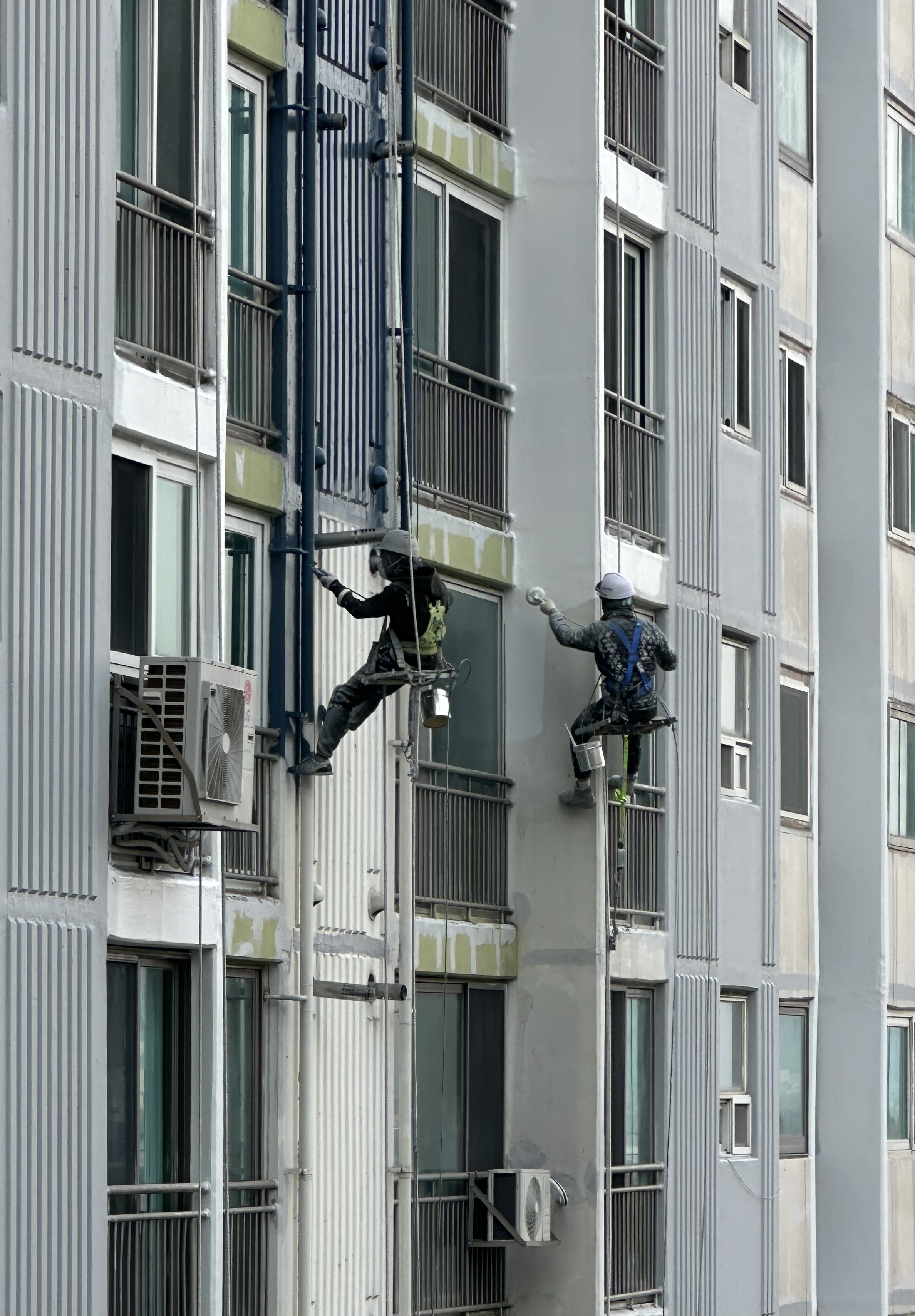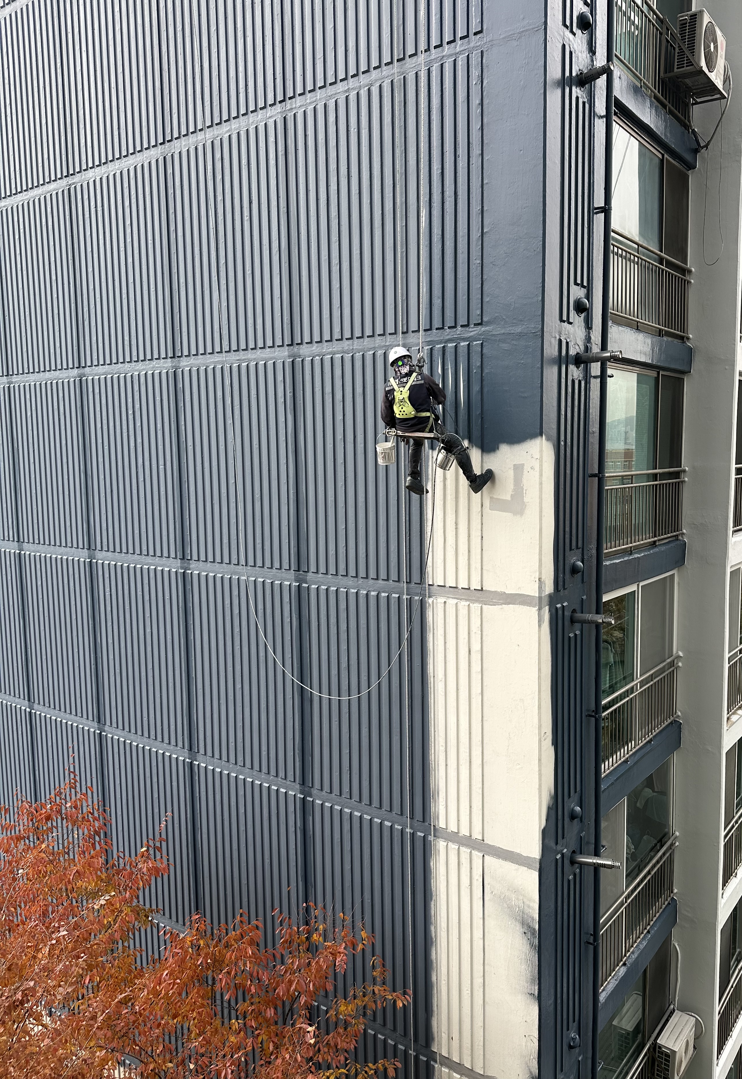 도색 작업 전에 퍼티 작업, 바인드 작업 등 그동안 떨어져 나가거나 틈이 생긴 부분을 떼우고 보롼하는데, 옥상에서 줄을 타고 내려오면서 하는 힘든 일이다. 중간에 비가 많이 오거나 바람이 세게 불면 중단하기도 하는데, 며칠 전부터는 도색 작업을 하느라 차들을 지하주차장으로 옮기거나 비닐을 씌우고 페인트를 분사하고 칠하기 시작했다.