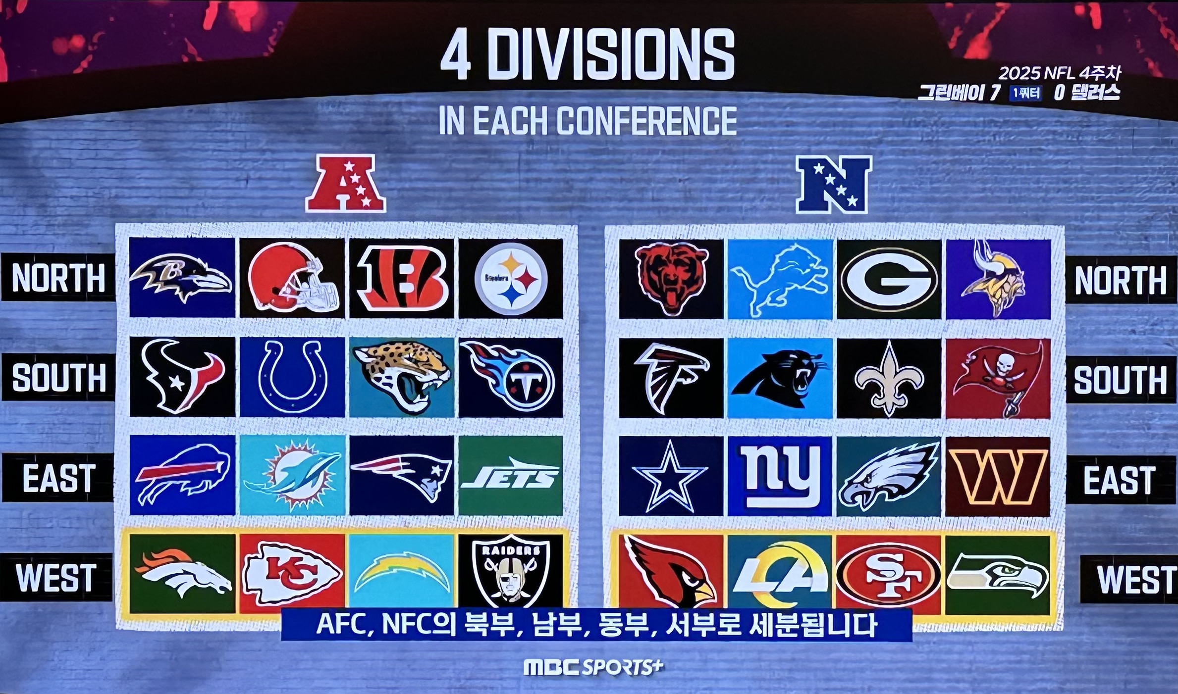 요즘은 캔자스시티, 필라델피아, 디트로이트 등이 잘 나가는데, 강팀들은 역시 좋은 쿼터백을 필두로 공격 조와 수비 조가 균형을 이루면서 상위권 성적을 내는 것 같다. 수십여 명에 이르는 코치와 스태프들의 세밀한 전략 분석과 지원도 여느 경기와는 다른 특성이기도 하다. 10야드 진격을 못하면 공수가 교대되는 사이에 애니메이션으로 경기 룰, 포지션 소개, 컨퍼런스와 디비전 소개 등을 보여주는데, 몇 번 보면 대충 이해가 된다,