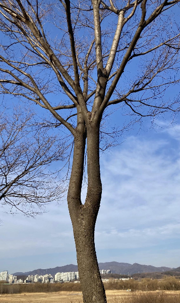 X자로 어긋나 자랐다면 멋진 사랑나무(연리지)가 됐을 법한 잘 생긴 나무 한 그루가 유난히 눈에 띄었다. 위로는 맑은 겨울 하늘을, 뒤로는 덕소 방면 아파트 단지들을 배경으로 청량한 이름다움을 선사해 주었다. 훌훌 벗어 던진 겨울이 아니었다면 이렇게 확연하게 눈에 띄지는 않았을 것이다.