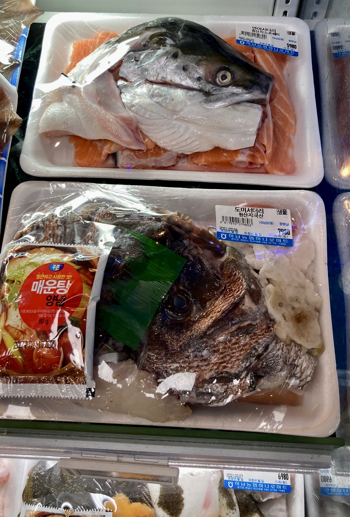 미사리에 새로 생긴 하나로마트는 야채 로컬 푸드가 많고, 소포장해서 팔아서 종종 가는데, 안쪽에 있는 수산물 코너도 구경할 게 많다. 지난주엔 연어를 횟감으로 뜨고 남은 대가리와 뼈들을 묶어 서더리로 파는 걸 아내가 한 팩 사 왔다. 이걸 소금과 후추만 뿌려 에어프라이어에 놓고 돌려 먹는 방법이 있다는 것이다.