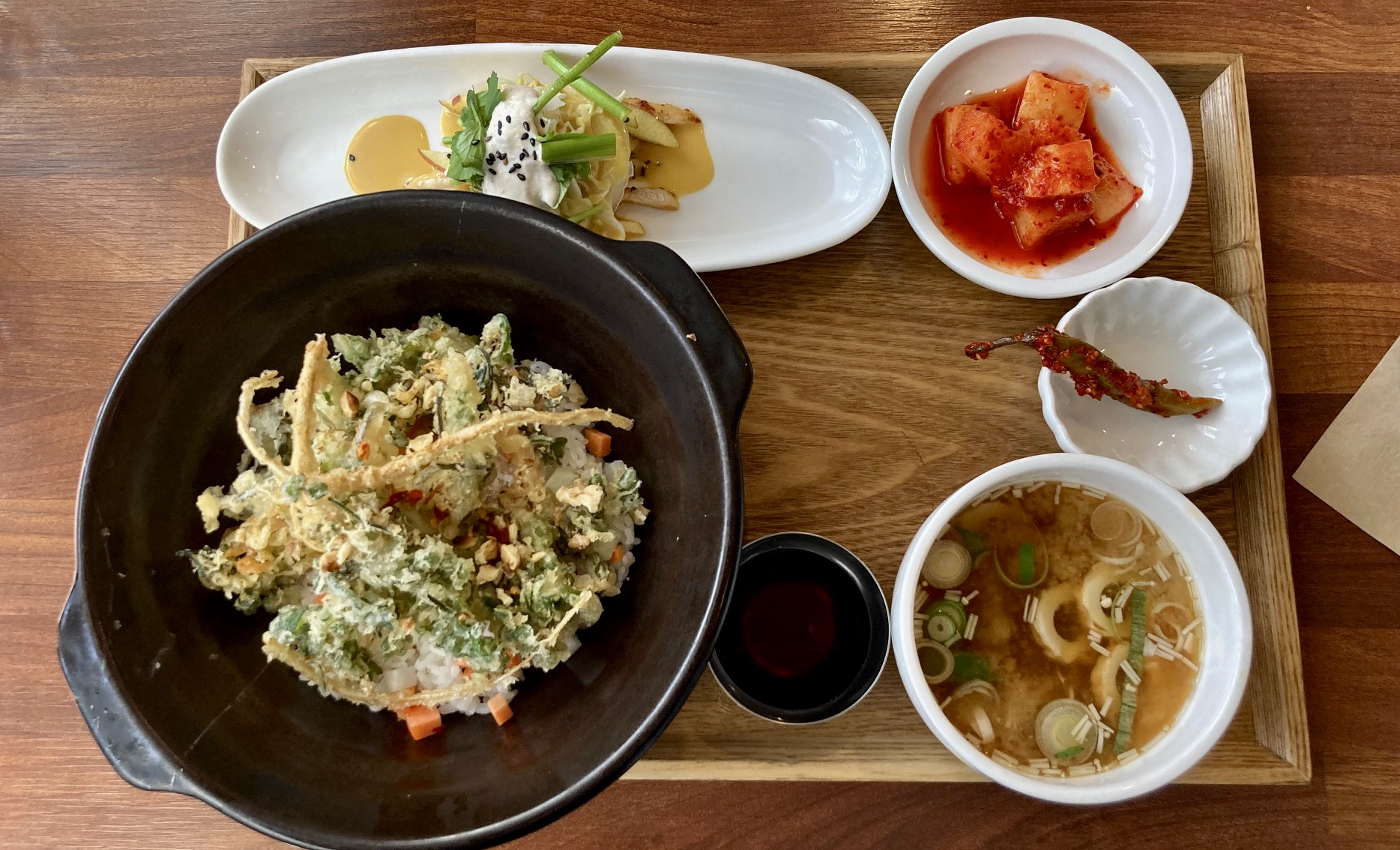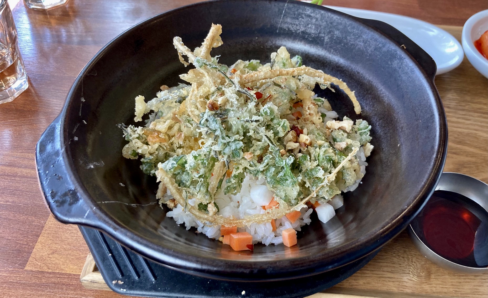 냉이 덮밥도 특이한데, 냉이튀김덮밥이라니 당연히 구미가 당겼다. 마침 테이블석이 예약 가능해 g네 집에 잠깐 들렸다가 셋이서 가서 먹고 왔다. 뜨겁게 달군 돌솥에 밥을 담고 달걀 노른자 위에 갓 튀긴 냉이 튀김이 얹혀 나왔는데, 이 식당에서 만든 짜지 않고 단 맛이 나는 간장 쏘스를 뿌려 먹었다.
