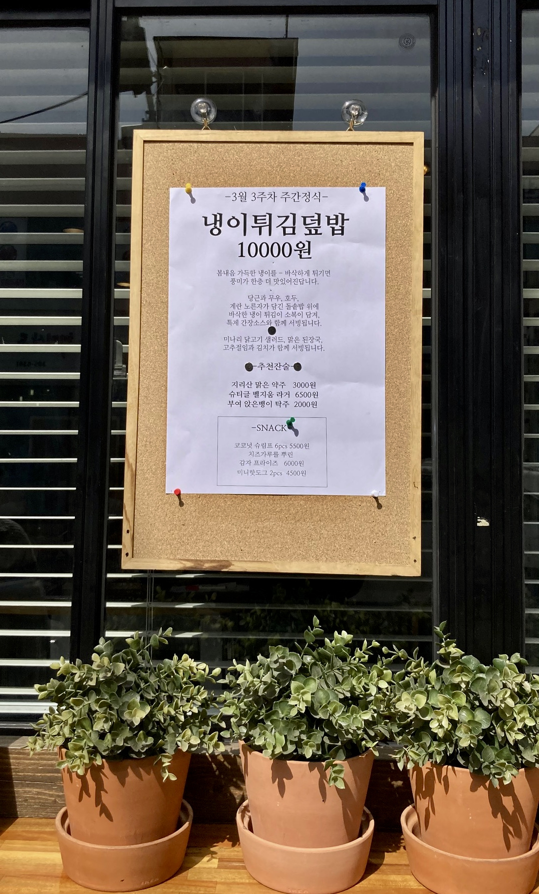망원동 골목은 한 집 건너 작은 맛집과 카페들인데, 그 중 '주간 정식당(Weekly Taste)'이란 다찌석 몇 개와 테이블 하나만 있는 식당이 있다. 이번 주, 그러니까 3월 셋째 주간엔 냉이튀김덮밥 메뉴 하나만 있는 식인데(주간 메뉴는 인스타그램에서), 여기에 '잔술'을 곁들일 수 있다. 주방장 맘대로인 일본 드라마 <심야식당> 분위기가 나는데, 한 걸음 더 나아가 한 주 한 메뉴만 고집하는 갓 같다.