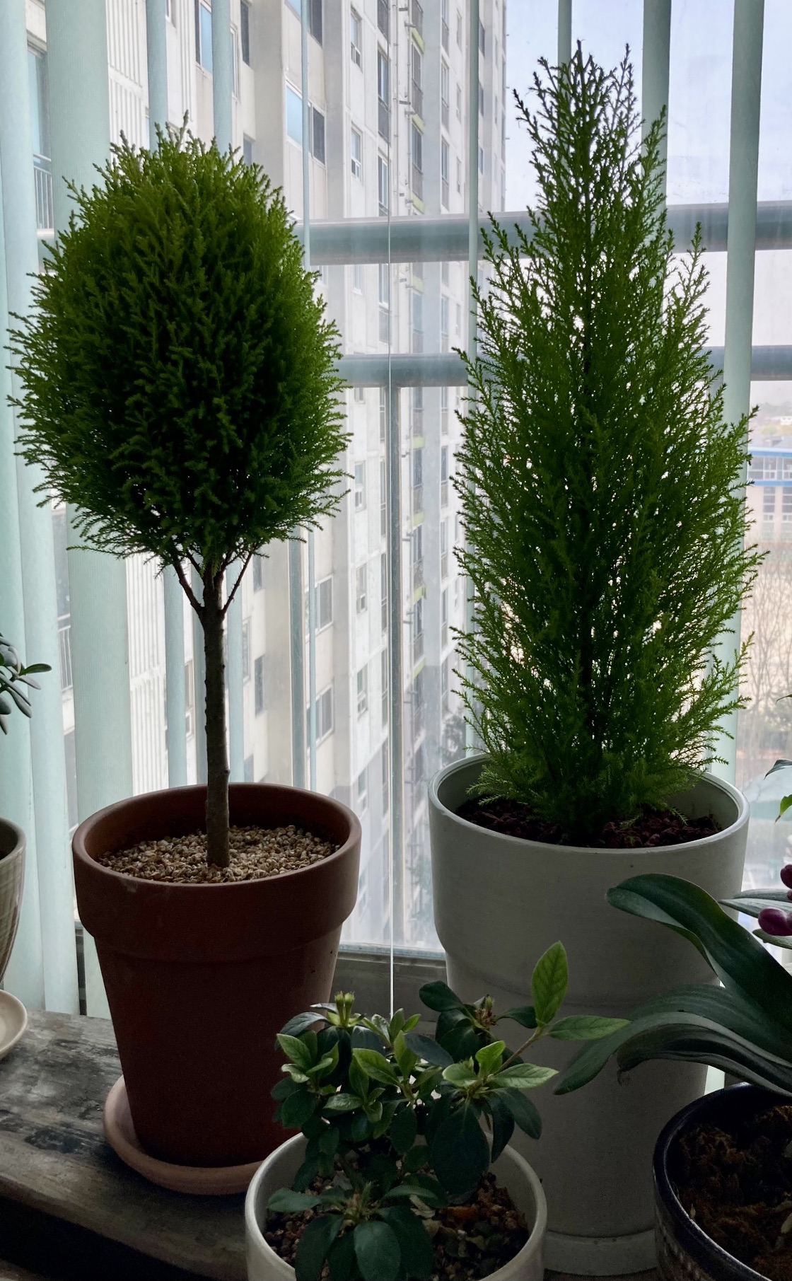 지난해부터 아내는 율마란 화초에 부쩍 관심을 보이기 시작했다. 보통 집에서 기르는 화초처럼 생기지도 않았고, 쓰다듬으면 허브처럼 향기가 나는데, 식물 팟캐스트와 인스타그램을 통해 새로운 정보들을 얻으면서 이 나무에 매료된 것 같았다. 처음 산 건 아담했는데, 몇 달 잘 자라는듯 하다가 우리집에 적응하지 못했는지 시들해졌다.