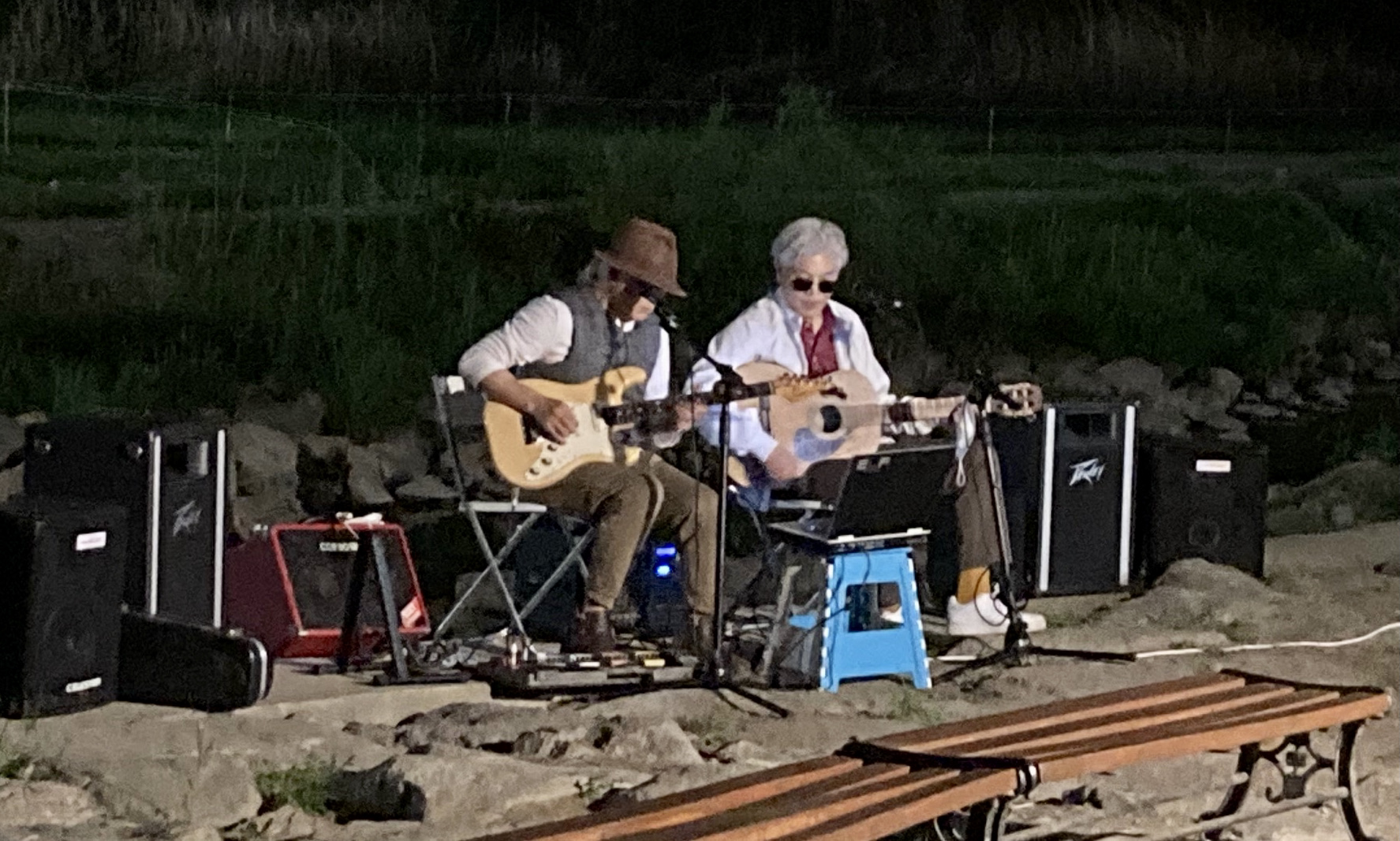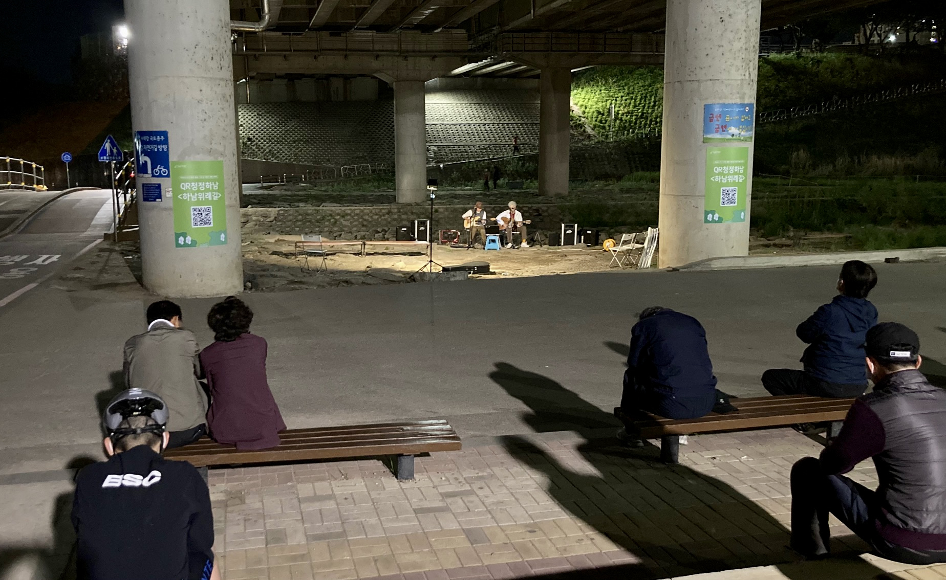 팔당대교로 이어지는 산곡천 다리 아래에 일렉과 통기타를 든 중년 가객 둘이 앰프와 스피커, 마이크를 설치하고 플라스틱 의자 위에 노트북을 놓고 팝송과 가요 몇 곡을 부르고 있었다. 노래도 괜찮지만 두 사람의 패션 감각도 못지 않았다.