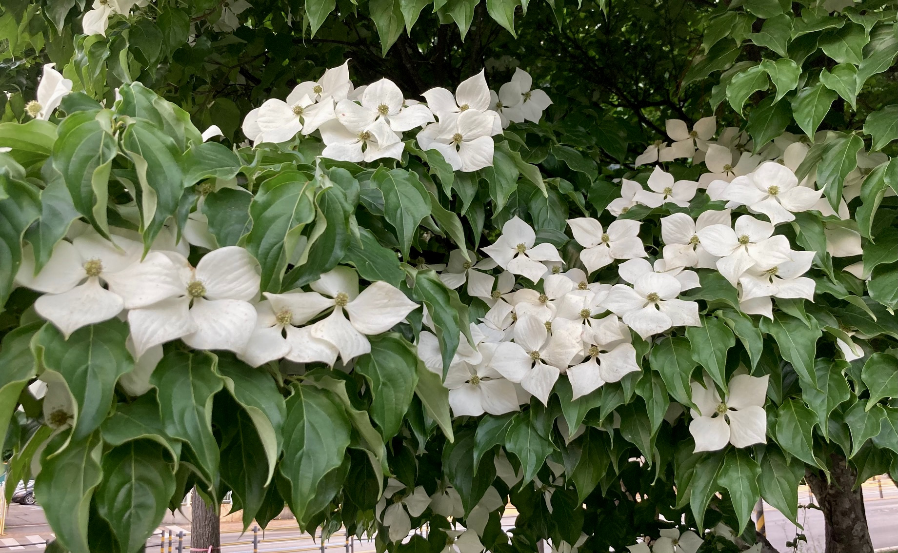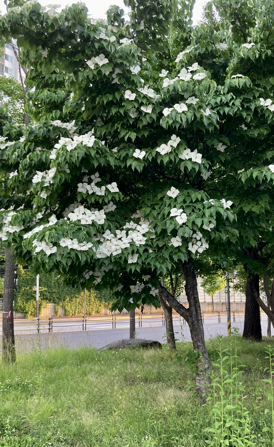 이팝나무처럼 산딸나무도 전에는 많이 안 보이던 게 요즘은 가로수나 공원수의 대표 주자 중 하나가 되었다. 키가 작은 화초들이 맺을 법한 꽃을 나무 위에 주렁주렁 맺고 있는데, 층층이 피어서인지 층층나무과에 속한다고 한다. 재밌는 건, 이렇게 꽃으로 보이는 흰색 잎이 사실은 꽃이 아니라 잎이 변형된 포엽이라는 건데, 이쯤 되면 꽃이라 불러도 되지 않을까 싶다.