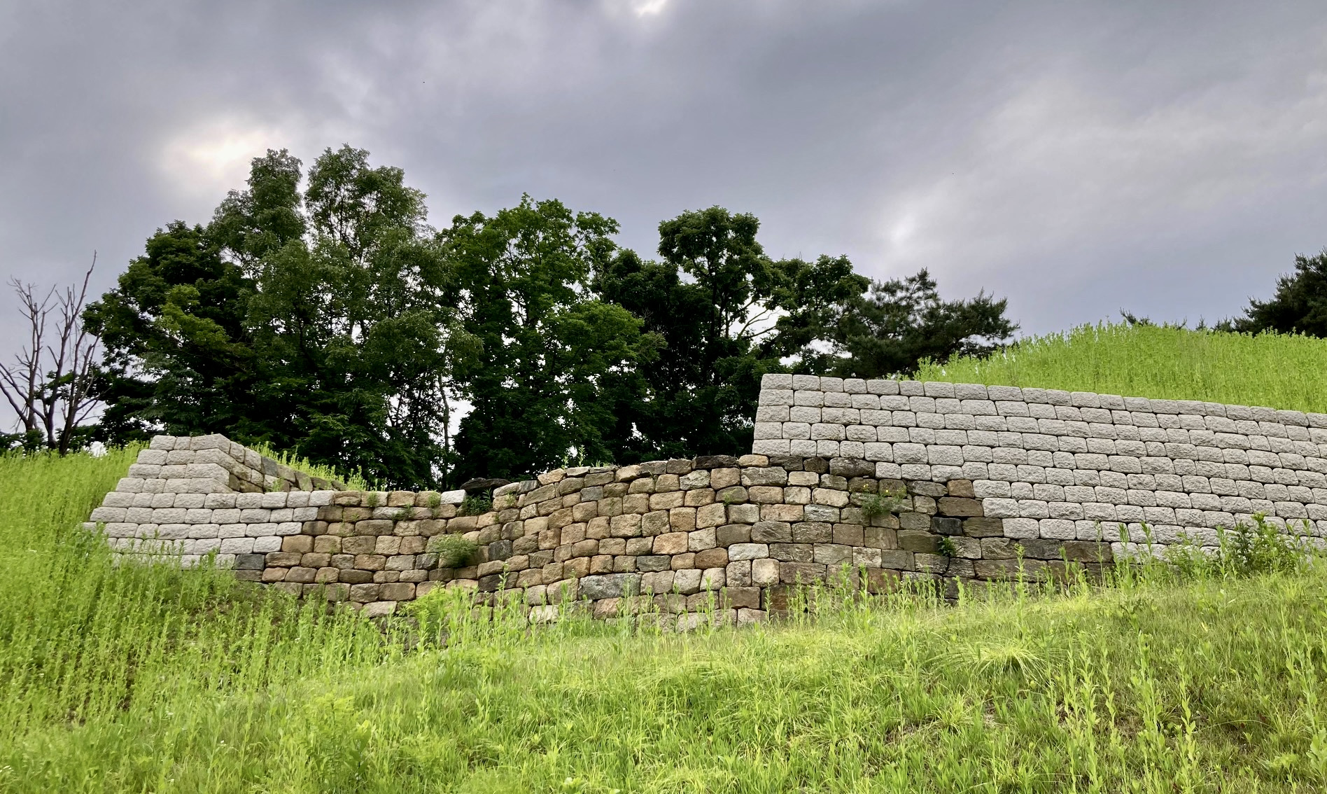 백제 시절 유적이라는 이성산성은 높이 2백 미터 남짓한 산세도 완만한데다가 시간도 오래 흘러 터와 흔적들은 남아 있지만, 이렇다 볼만한 것은 아직 갖추지 못하고 있다. 이런 성터의 대표적인 흔적은 돌담인데, 그 시절 돌은 아니겠고, 나중에 축조한 것들이 조금 남아 있다. 그걸 다듬어 다시 쌓고, 좌우에 새 돌담을 세워 놓았다. 옛 돌담과 새 돌담은 확연한 차이가 나지만, 이렇게 해 놓으니 제법 산성 분위기가 난다.