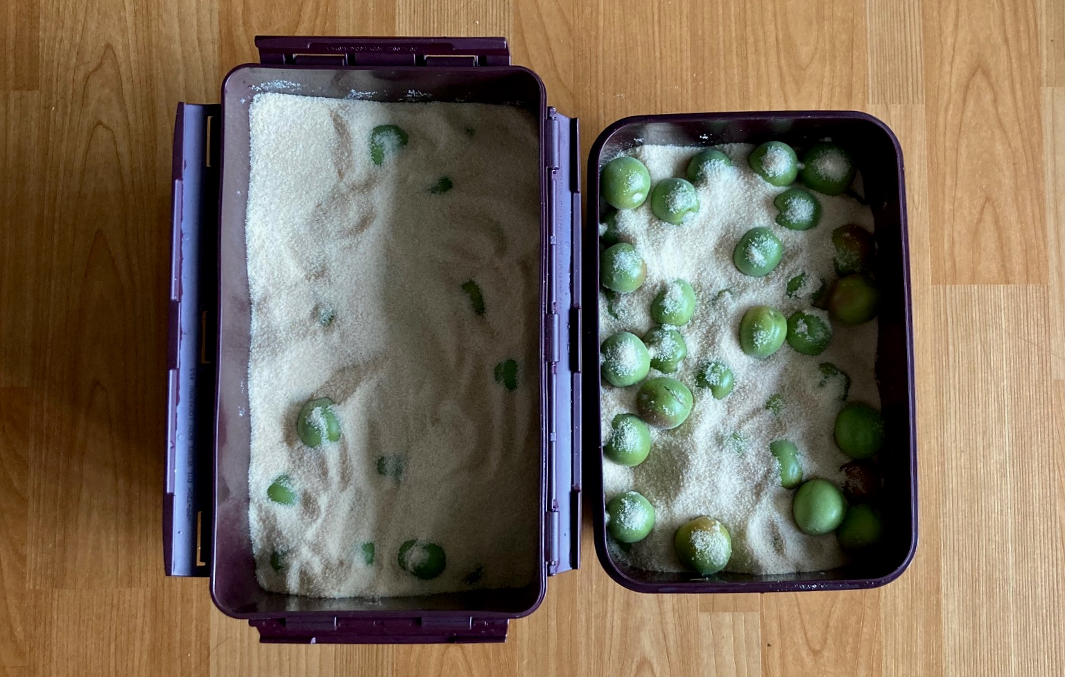 깨끗이 씻어 물기를 뺀 다음 이쑤시개로 매실 꼭지를 파내고, 김장통에 매실 한 층, 황설탕 한 층을 덮는 식으로 차곡차곡 빼곡하게 담가두면 매실청이 생긴단다. 통으로 넣지 않고 잘라 넣는 집도 있고, 황설탕 대신 백설탕, 올리고당을 넣는 집이 있듯이, 숙성 시기는 집집마다 다른데 석 달 정도 지나면 된다고 한다.