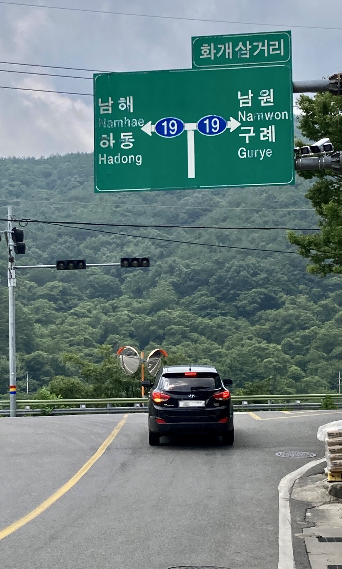 숙소를 구례가 아닌 하동에 있는 켄싱턴 리조트로 잡아 본의 아니게 이번 남도여행에선 세 군데를 다닌 셈이다. 섬진강을 끼고 있는 구례와 하동은 붙어 있지만 화개장터에서 전라도와 경상도로 나뉜다. 도로에 서 있는 이정표 사진을 좋아하지만 운전하면서 일일이 찍기는 무리인데, 마침 오가는 차들이 없어서 운전석 창문을 내리고 한 장 건졌다.^^