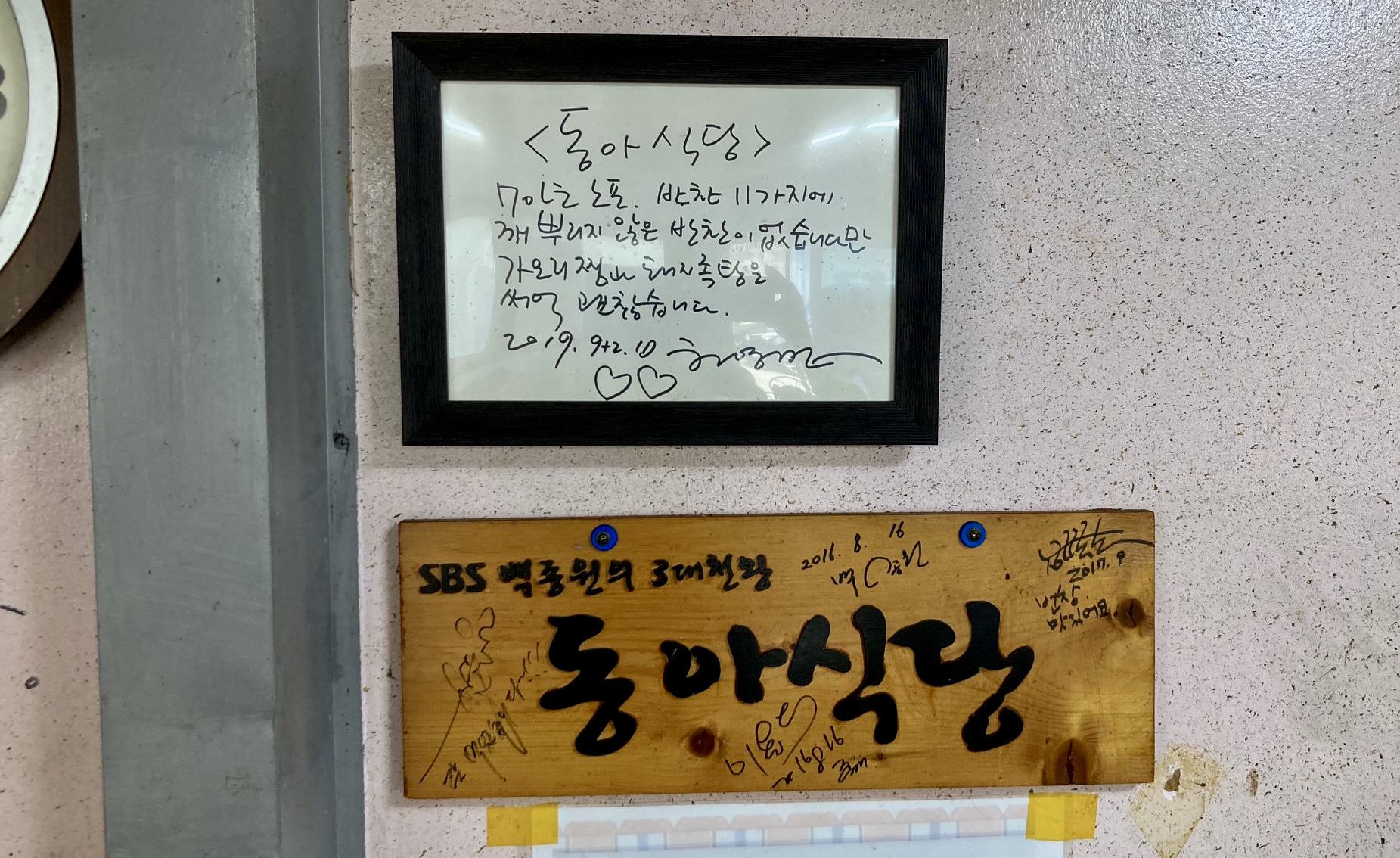 주방엔 맛집계의 양대산맥 격인 허영만 선생과 백종원이 다녀간 집임을 인증하는 액자와 현판이 붙어 있었다. 다 먹고 계산하려는데, 주인 아주머니가 외출하시는 바람에 10여분 기다려야 했다. 카드가 안 돼 살짝 난감했지만, 계좌이체를 해 드리겠다고 하니 통장번호를 주는 게 아니라 통장째 주면서 나중에 은행가서 찍히면 볼 테니 알아서 입금하라는 시골 인심을 보여주었다.^^