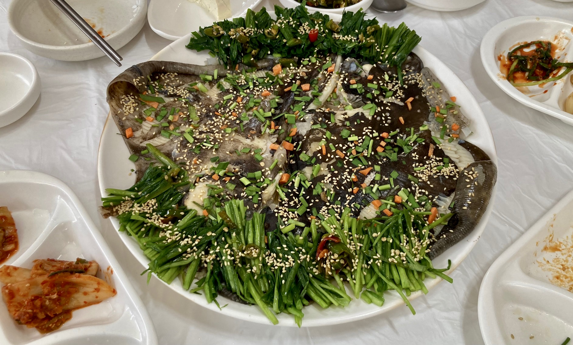 하동과 구례에선 1박2일 머물면서 딱 한 끼만 사 먹었다. 켄싱턴 리조트에서 야식으로 치킨과 피자가 나와 저녁은 충분했고, 조식 부페까지 패키지로 이용해 구례 5일장 시장 골목에서 늦은 점심만 해결하면 됐다. 동아식당은 가오리찜을 내는 집으로 구례 여행에서 1순위로 찜했다. 미나리와 부추를 얹은 가오리찜은 일단 비주얼에서 압도적이었다.