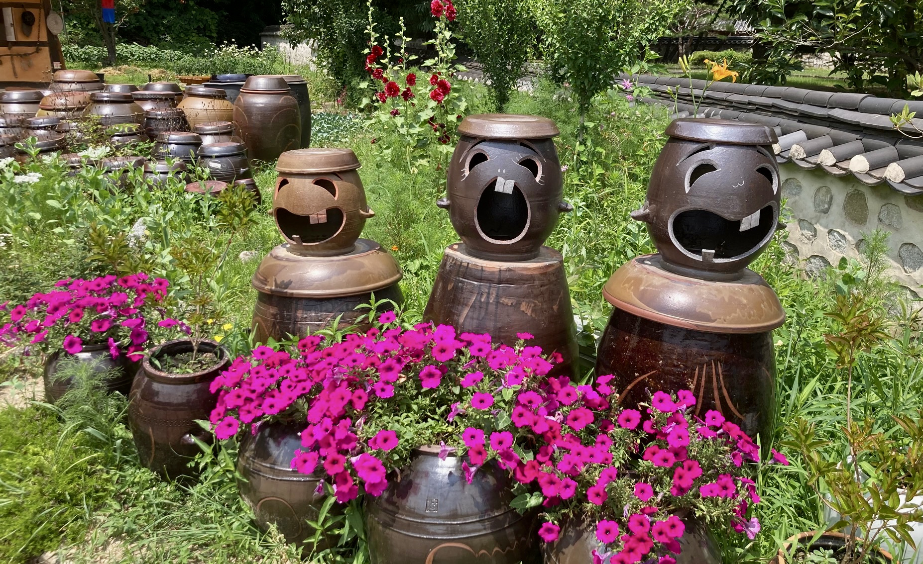 중간중간 주위 풍경에 눈을 돌리는데, 마당 한 편에 길게 놓인 장독대 항아리들이 시골 음식 비밀의 원천을 알려주고 있었다. 그 중에서도 꽃들 사이에서 2층에 올라선 항아리 셋은 무엇이 그리 즐거운지 입을 활짝 벌리고 몇 남지 않은 윗니를 드러내면서 화알짝 파안대소하고 있었다. 항아리 장인의 눈썰미와 조각 솜씨가 시골 장독대 풍경을 유쾌하게 만들어주고 있었다.