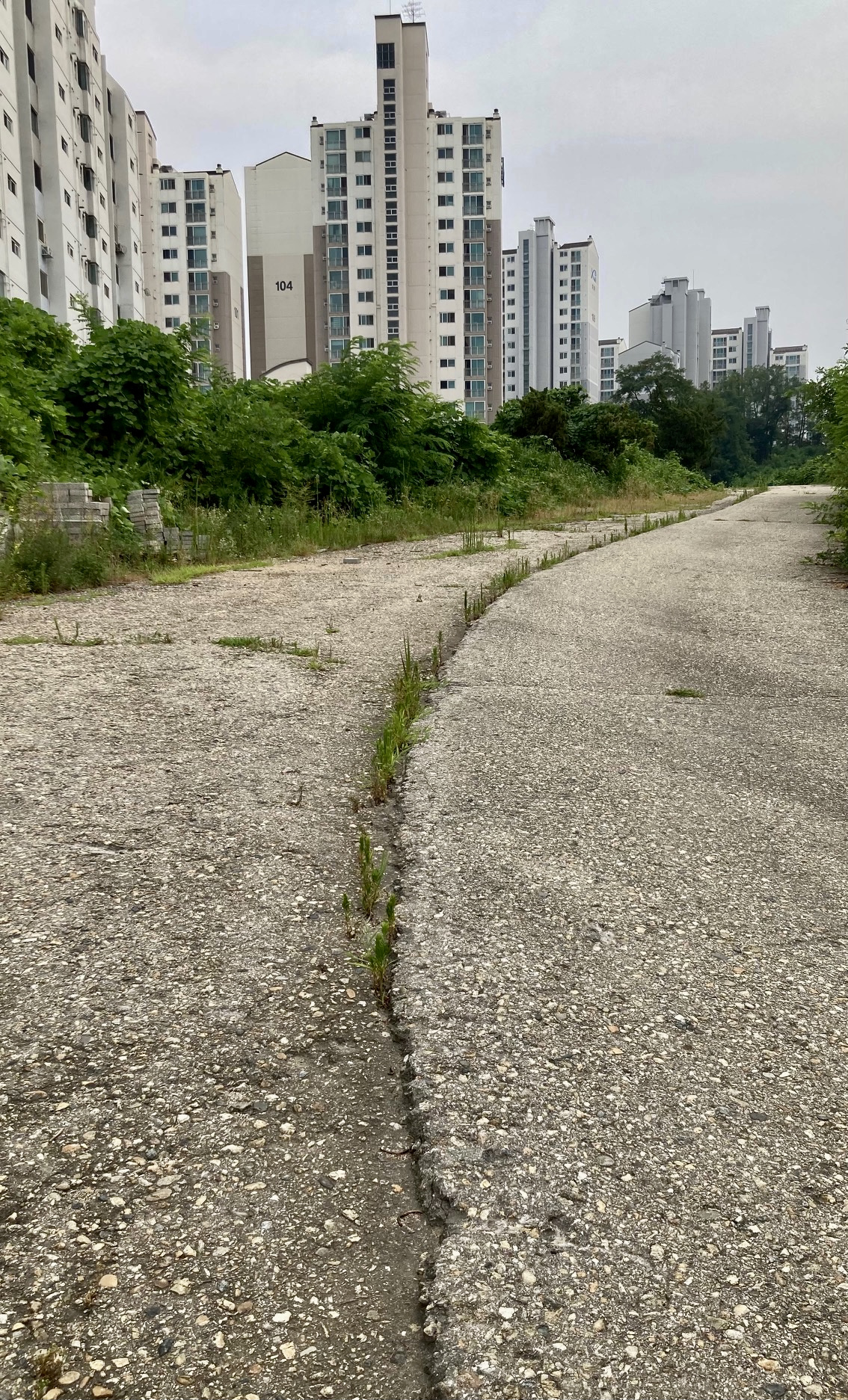 잡풀은 아스팔트 연결 부위만 아니라 군데군데 아스팔트가 파이거나 틈이 생긴 곳엔 어김없이 뿌리를 내리고 있었다. 그늘이라곤 없고, 아스팔트 복사열도 상당할 텐데, 생존이 쉽지 않은 악조건에서도 이네들의 뿌리 내리기는 가히 경이로워 보인다. 별것 아니지만, 바로 옆으로 이어지는 산길의 어느 시원한 풍경 못지 않은 생명력에 자꾸만 눈이 갔다.