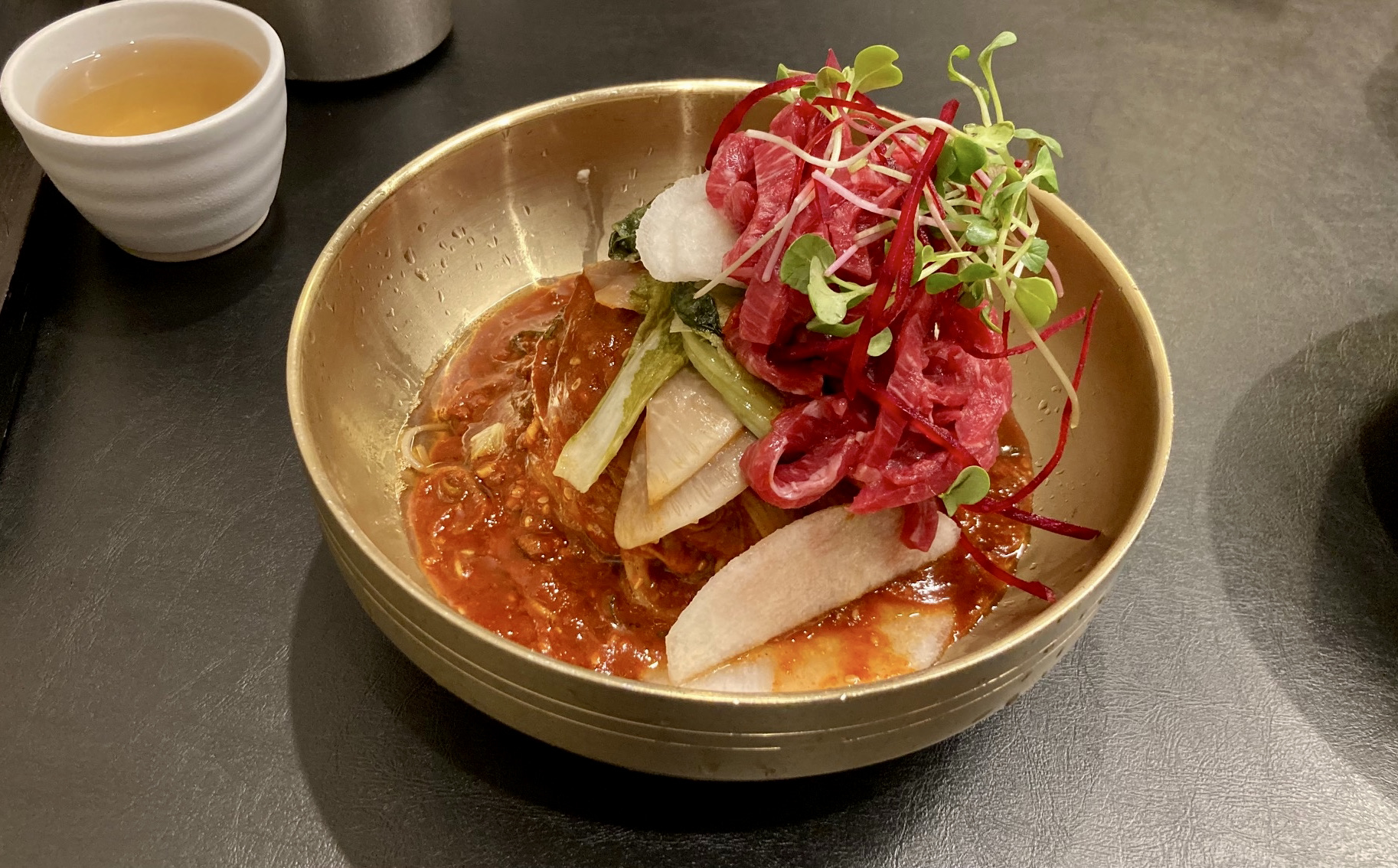 g의 말마따나 우래옥 다음으로 국물 육향이 나서 먹기 좋았다. 차갑고 시원한 면도 이빨로 잘 끊어지고, 중간중간 시원한 국물 들이키는 맛이 그럴듯 했다. 기본 간에 반쯤 먹고 겨자와 식초를 조금 넣을까 했는데, 그럴 필요 없이 나온 그대로 입맛을 충족시켰다. 막내는 육회 60g이 올라간 육회냉면(만5천원)을 시켰는데, 꽤 만족해 했다.