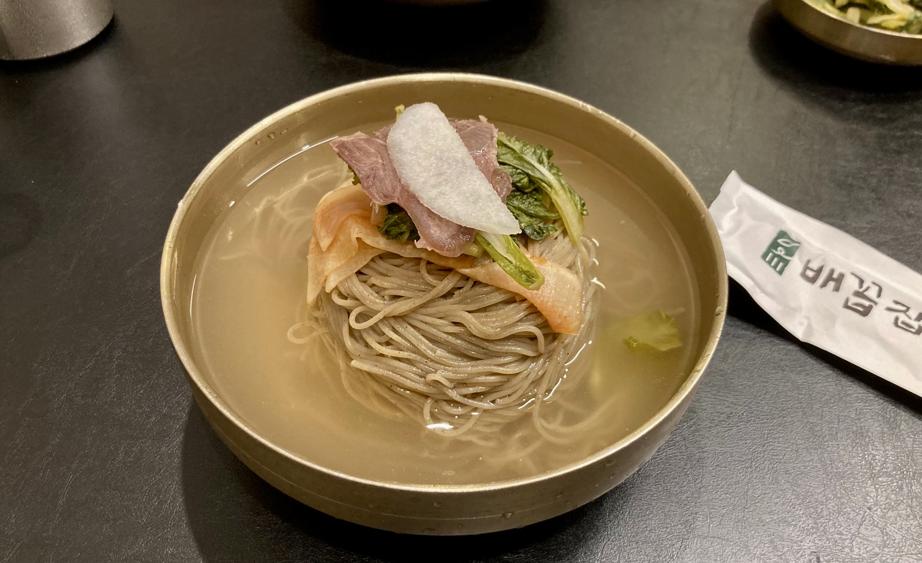 웬만한 평양냉면집은 두루 섭렵한 g가 미사에 냉면집 괜찮은 데가 있다길래 더위도 식힐 겸 갔다 왔다. 미사지구 아파트들 사이는 아니고, 옛날에 카페들이 즐비하던 경정장 건너편 도로변 새로 생긴 빌딩 1층에 자리 잡은 배꼽집이다. 고기집인데, 고기가 들어가는 냉면과 전골도 메뉴에 보인다. 만 3천원 받는 물냉면 곱배기를 시켰는데, 놋대접에 듬뿍 담겨 나왔다.
