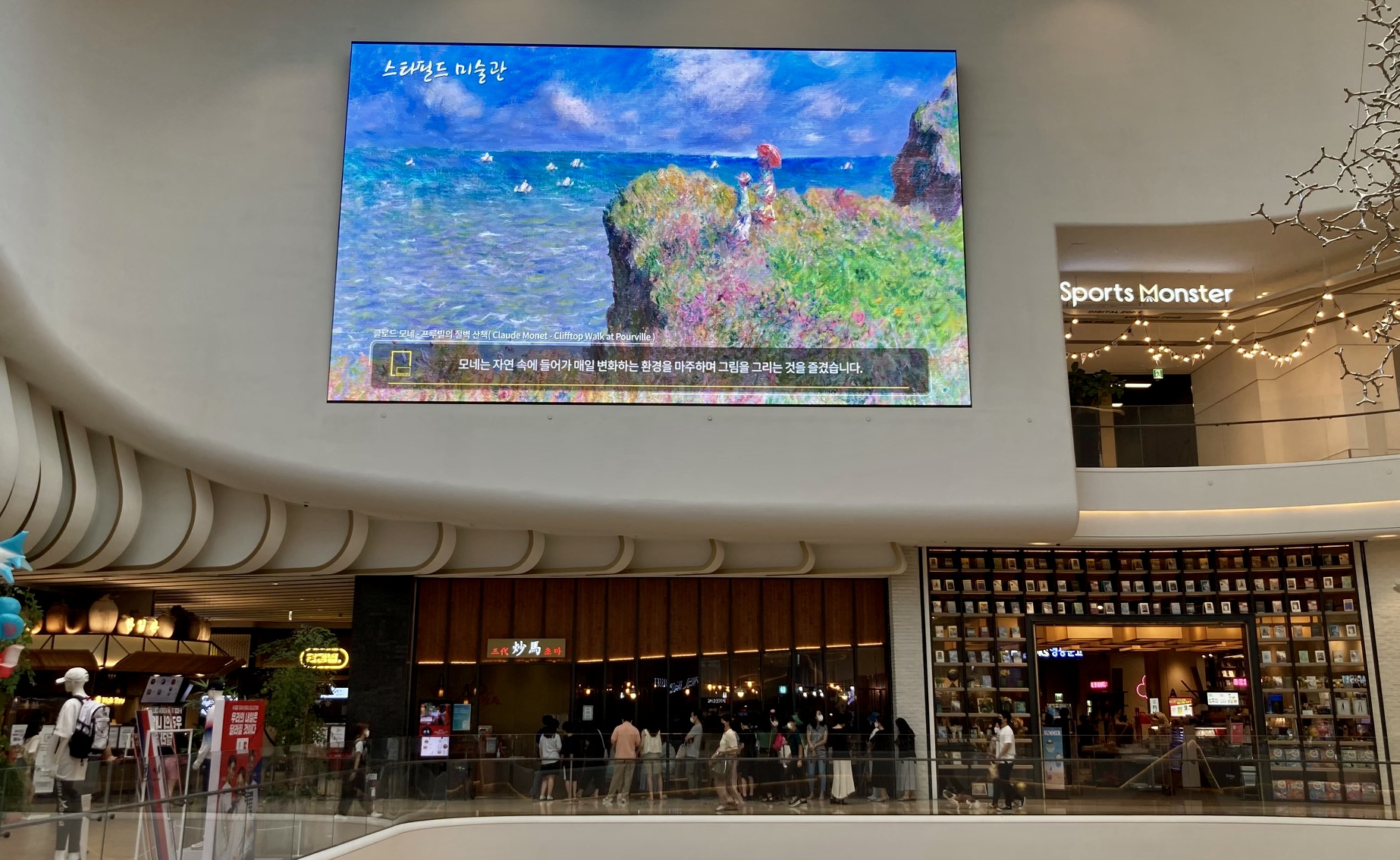내부에 들어서면 거의 어디서나 보이는 이 대형 스크린은 가로가 얼추 10m는 될 것 같은데, 16:9 비율로 유명 화가들의 잘 알려진 그림을 배경으로 보여줄 때가 많다. 디지털로 보여 주는 원화는 선명한데다, 외곽 부분을 살짝 움직이는 애니메이션 기능을 첨가해 작은 원화보다 오히려 보기가 좋다.