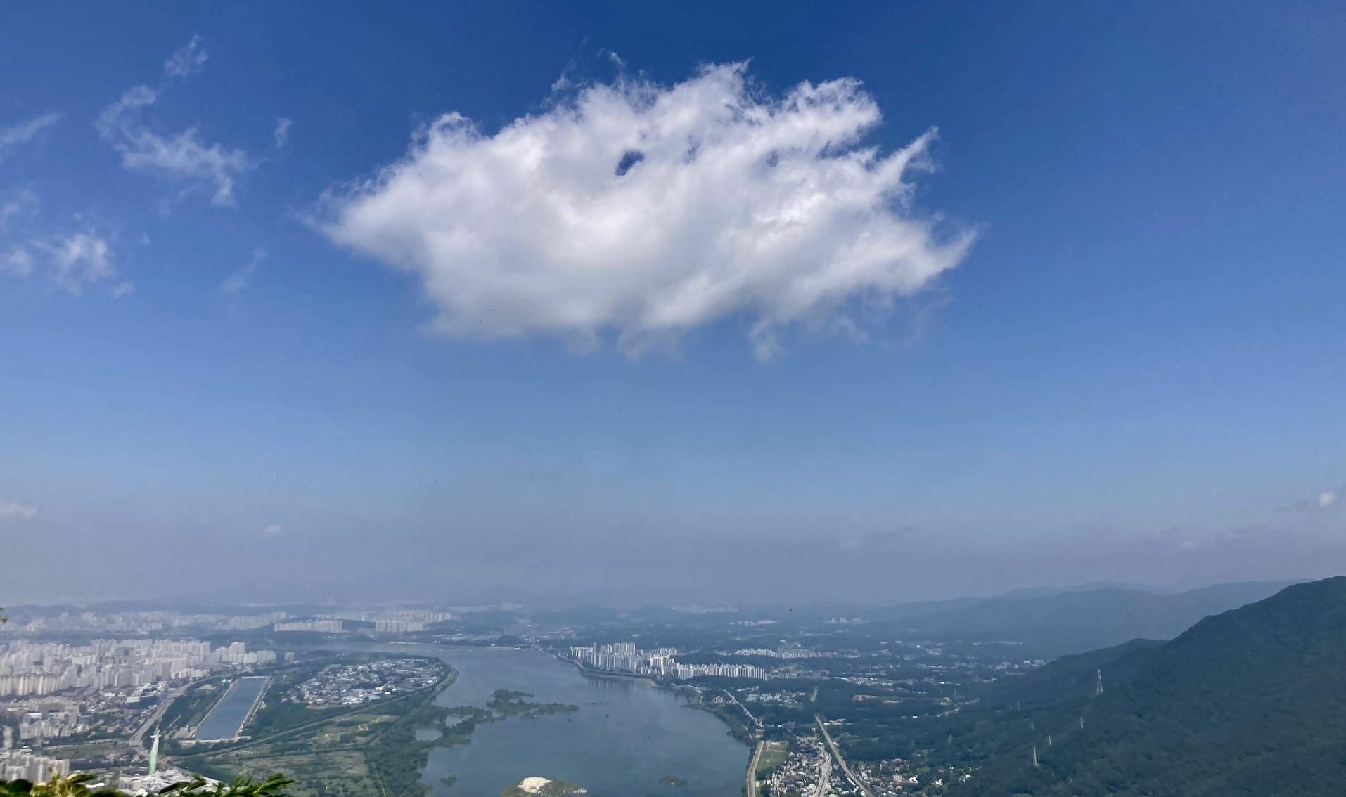 이런 구름을 본 날 앞뒤엔 검단산을 오르게 마련인데, 전망대 못 미쳐 너덜 구간 바위에 오르면 아랫쪽 시야가 확 트이면서 오른쪽으론 예봉산이, 가운데로는 한강이, 왼쪽으로는 조정경기장과 미사 지구에 이어 서울까지 한 눈에 조망할 수 있다. 예까지 올랐으니 대륙처럼 생긴 큰 구름을 한 번 보여주겠다는 듯이 흰 구름이 둥실 떠 있다. 등산을 부르는 구름이다.