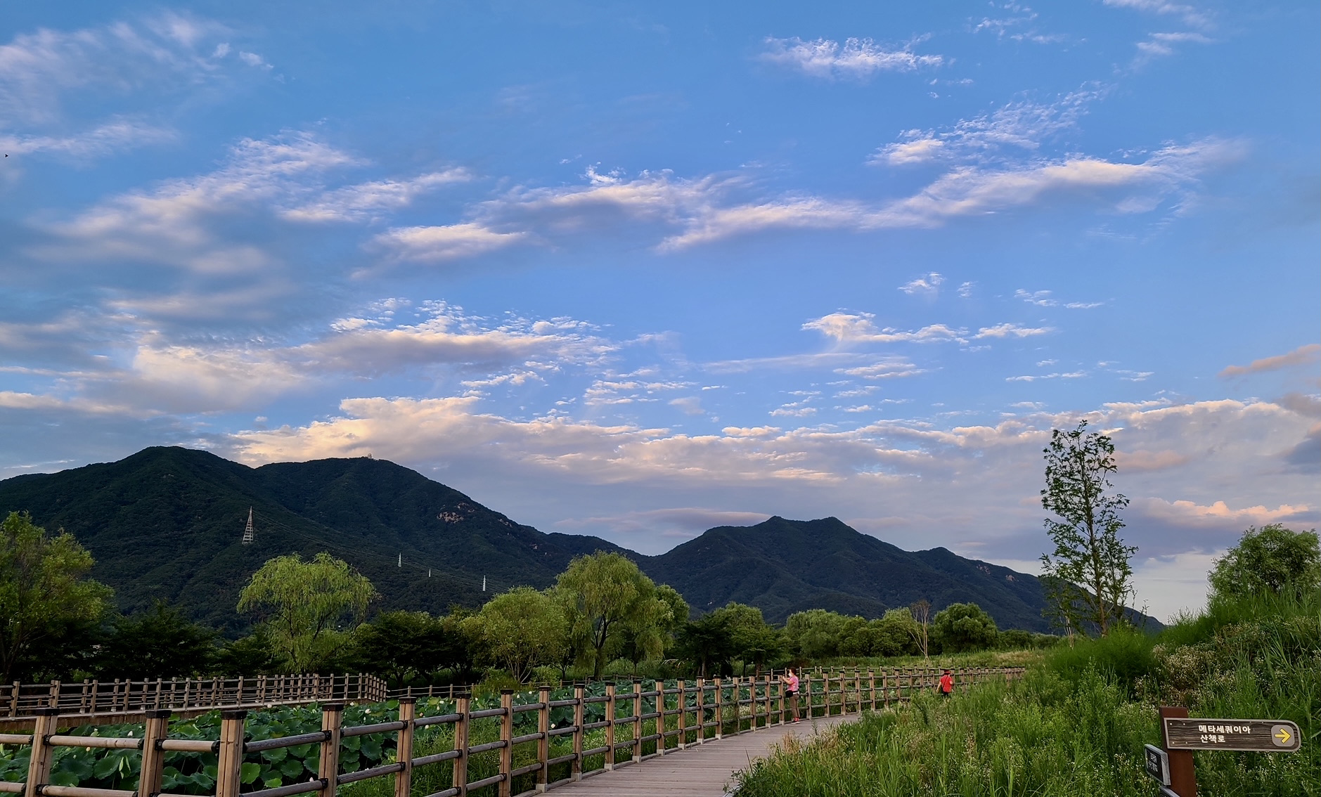 요즘, 구름이 볼만 하다. 저녁 나절 강변 산책로에서 한강 건너 예봉산과 예빈산을 수놓는 구름들은 언제나 좋지만, 특히 해 뜰 때와 해 질 때 풍경은 우열을 가리기 어렵다. 산책로 가운데길엔 연꽃잎이 무성한 연못이 있는데, 마침 밝은색 옷을 입은 산보객들이 풍경화에 약간의 생동감을 더해 주었다. 산책을 부르는 구름이다.