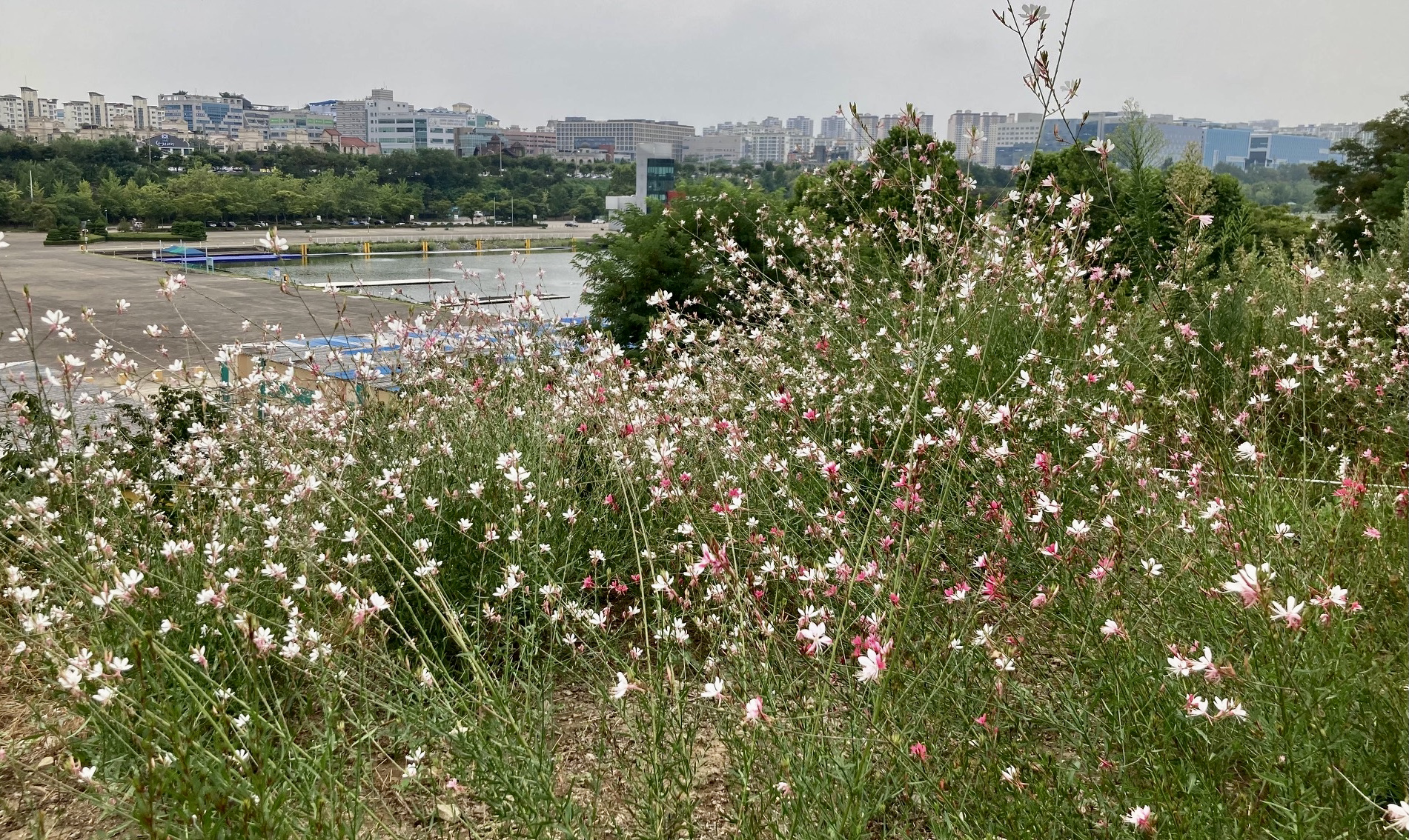 다행히 꽃이름 팻말을 달아 놓았는데, 밖으로 삐져나온 꽃술이 길다란 바늘처럼 생긴 가우라(Gaura)라는 바늘꽃과 꽃이었다. 흰색과 연분홍 꽃이 한데 어울려 피는데, 나비가 앉아 있는 모습과 흡사해 나비바늘꽃(whirling butterflies)이라 부르기도 한다. 9월엔 열매도 익는다는데, 한 달 뒤쯤 가을이 오면 슬슬 걸으면서 확인할 일이 생겼다.