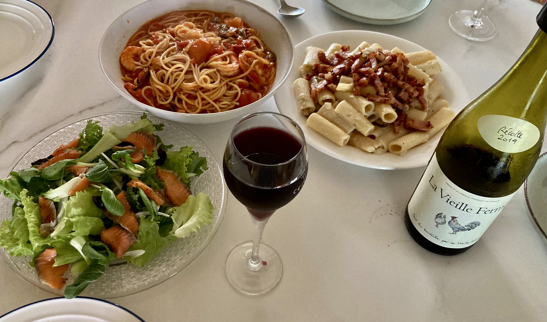 주일 예배를 마치고 아내와 g가 파스타를 하나씩 만들었는데, 접시에 내오는 걸 보니 기분 좋은 패밀리 사이즈였다. 접시에 두 파스타를 조금씩 덜어서 연어 샐러드와 함께 후루룩쭈욱 즐겁게 먹었다. 크림 파스타 위에 올린 건 이태리 베이컨 판체타(pancetta)이고, 손가락처럼 생긴 파스타면은 리가토니(rigatoni)라고 한다.