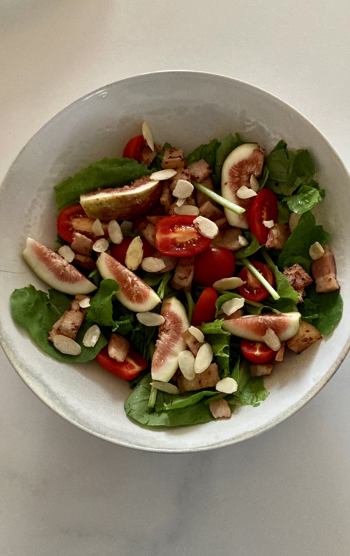 대형마트 과일 코너에 무화과가 보이기 시작한 걸 보니 무화과의 계절이 왔나 보다. 주로 사과처럼 조각내서 먹거나 한 입씩 베물어 먹는데, 아내가 샐러드로 변주했다. 좀 더 작게 자른 무화과가 주연이지만, 몇 가지 재료가 한데 어우러졌다. 피자 위에 얹어 먹는 루꼴라, 방울 토마토에 이탈리아 베이컨 판체타 조각 그리고 슬라이스 아몬드가 얹혔다.