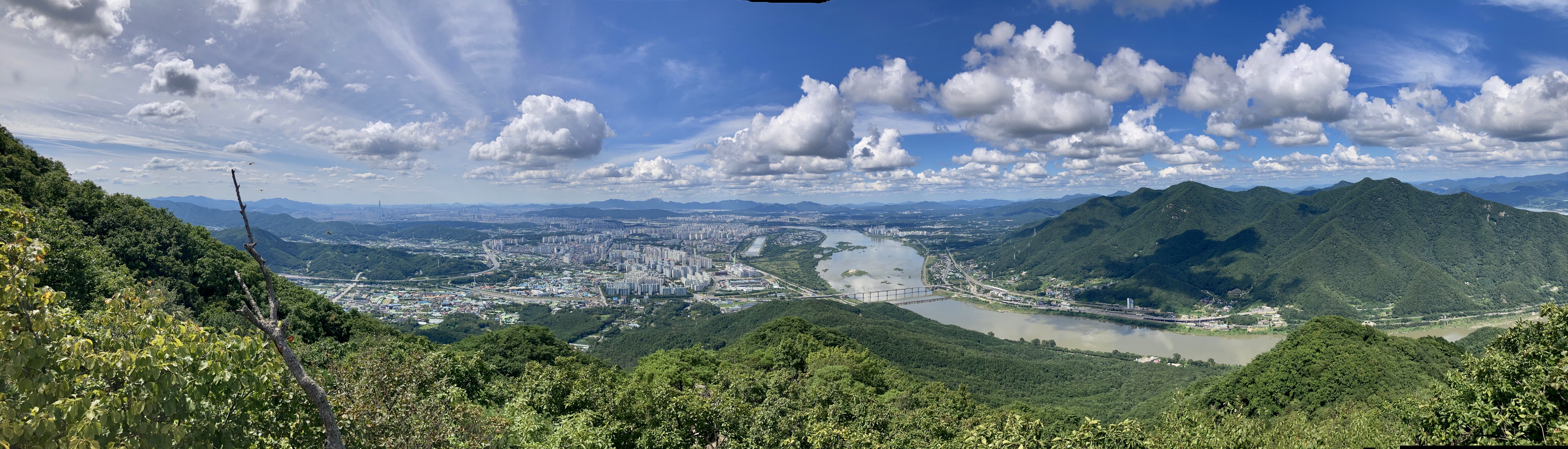 한강을 중심으로 예봉산을 비롯해 건너편 산들과 우리 동네 아파트 단지들이 한 눈에 들어온다. 팔당대교와 조정경기장, 스타필드와 강변 산책로에 저 멀리 도봉산과 북한산 위로 온 하늘을 수두룩빽빽하게 채운 구름은 마치 비행 편대를 이루는 것 같았고, 초가을 하늘과 풍경이 더할 나위 없이 좋았다.