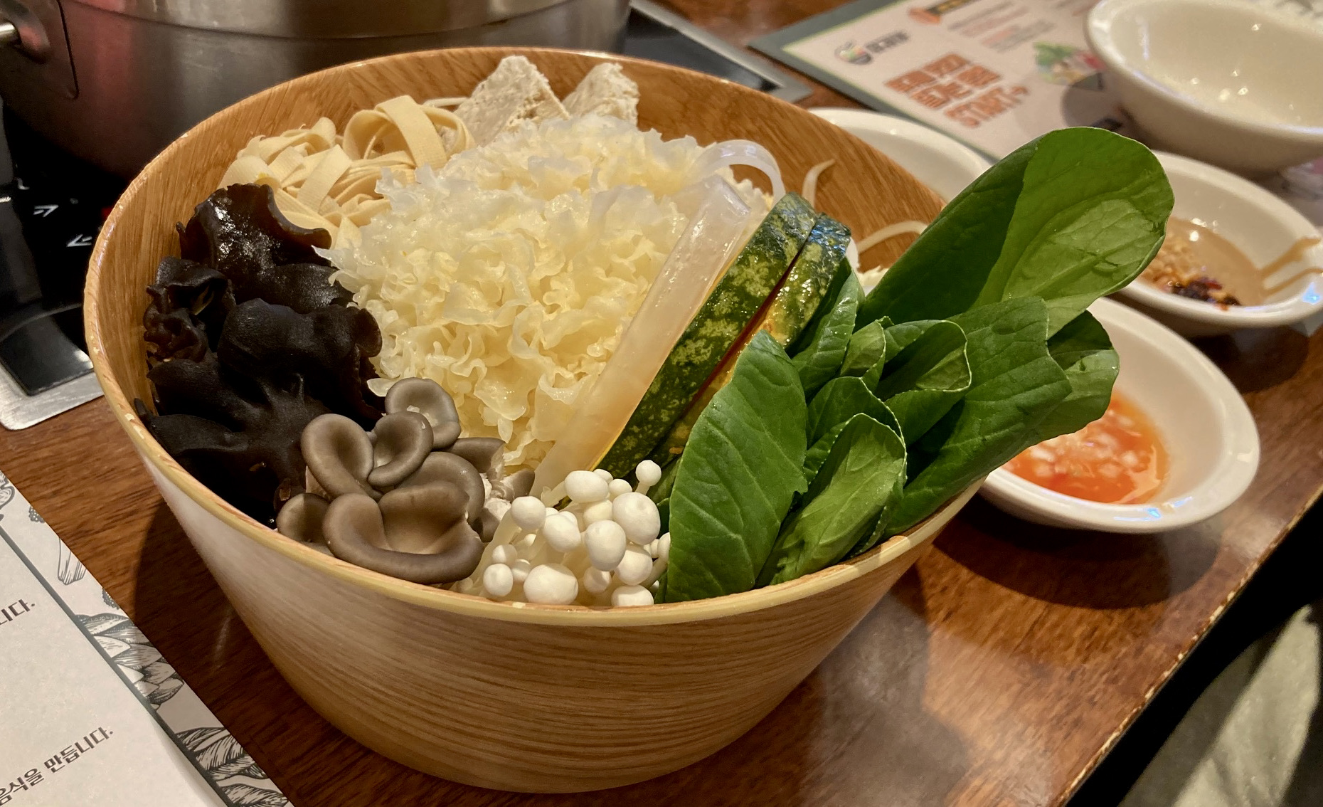 커다란 나무 바구니에 소담스레 담긴 야채들은 조금 과장해서 말하자면 탕에 넣어도 넣어도 바닥을 드러내지 않는 것 같았다. 한쪽에 마련된 소스 코너에선 마장 소스를 비롯해 각종 기름과 양념, 향신료들을 취향껏 덜어 조합할 수 있는데, 난 참기름에 땅콩 간 것만 넣어 찍어먹는 게 가장 좋았다.
