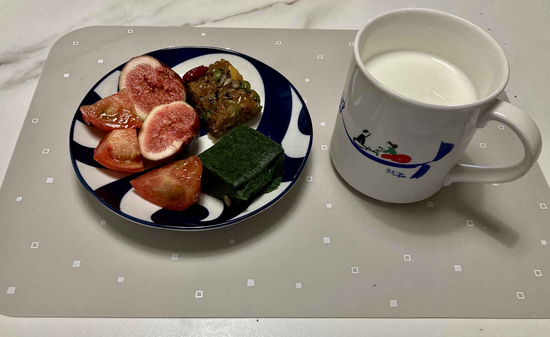 한동안 안 쓰고 있던 컵은 오래 전 제주도에서 사 온 건데, 이왈종 선생의 그림이 그려진 세트다. 접시는 몇 해 전에 뉴질랜드 갔을 때 우연히 들어간 다이소(1/3/19)에서 사 온 건데, 잘 쓰고 있다. 얼마 전에 바꾼 세라믹 식탁은 깔끔하긴 한데 그릇을 놓을 때마다 탁 탁 소리가 거슬려, 자주에서 실리콘 테이블 매트를 사서 소리를 좀 줄였다.