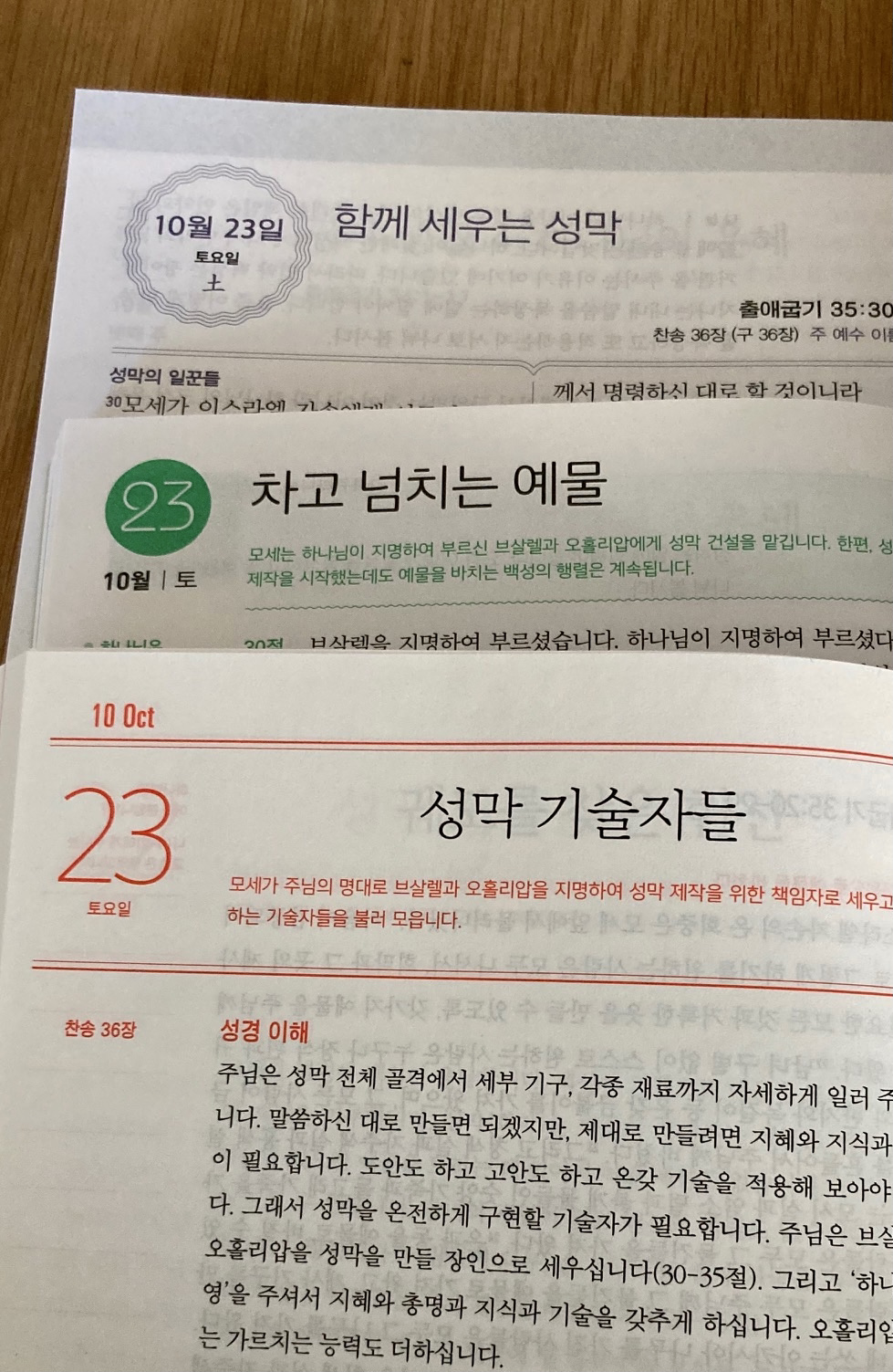 어제 본문은 성막을 세우는 작업을 총지휘하는 브살렐과 오홀리압이 나오는 출애굽기 35-36장이었는데, 세 책이 타이틀을 다르게 붙인 게 눈에 띄었다. 메인인 <매일성경>은 "차고 넘치는 예물"로, 새번역을 사용하는 <순>은 "성막 기술자들"로, 시니어 독자들이 보는 <시니어 매일성경>은 "함께 세우는 성막"으로 각각 포인트를 달리해 제목을 뽑았다.