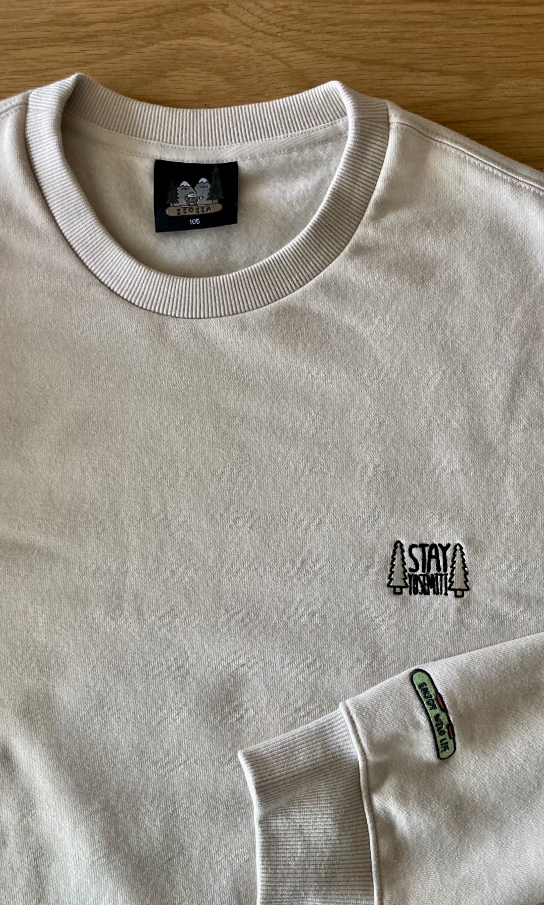 세상에, Stay Yosemiti라니! 마음의 고향 요세미티를 입고 다니는 거니, 이런 건 무조건 사야 한다. 게다가 안에 기모도 들어 있고 가격도 괜찮다. 마침 요즘 입을 라운드 티셔츠가 필요했는데, 아내가 아이보리 컬러를 권했다. 집에 와 펼쳐보니, 왼팔 손목 부분에 Enjoy Wild Life도 새겨 있고, 목 뒷부분에도 비슷하게 포인트를 주고 있었다.