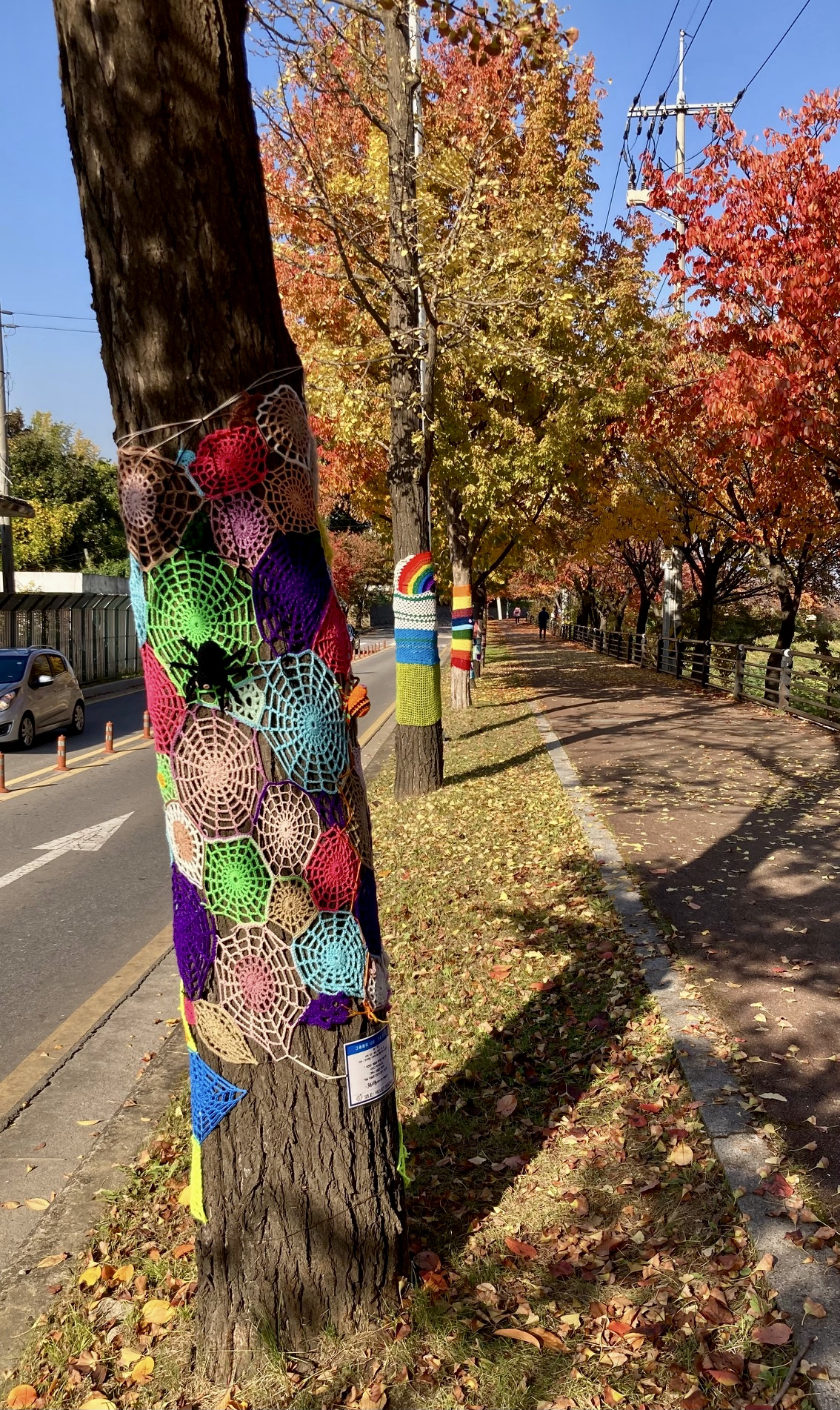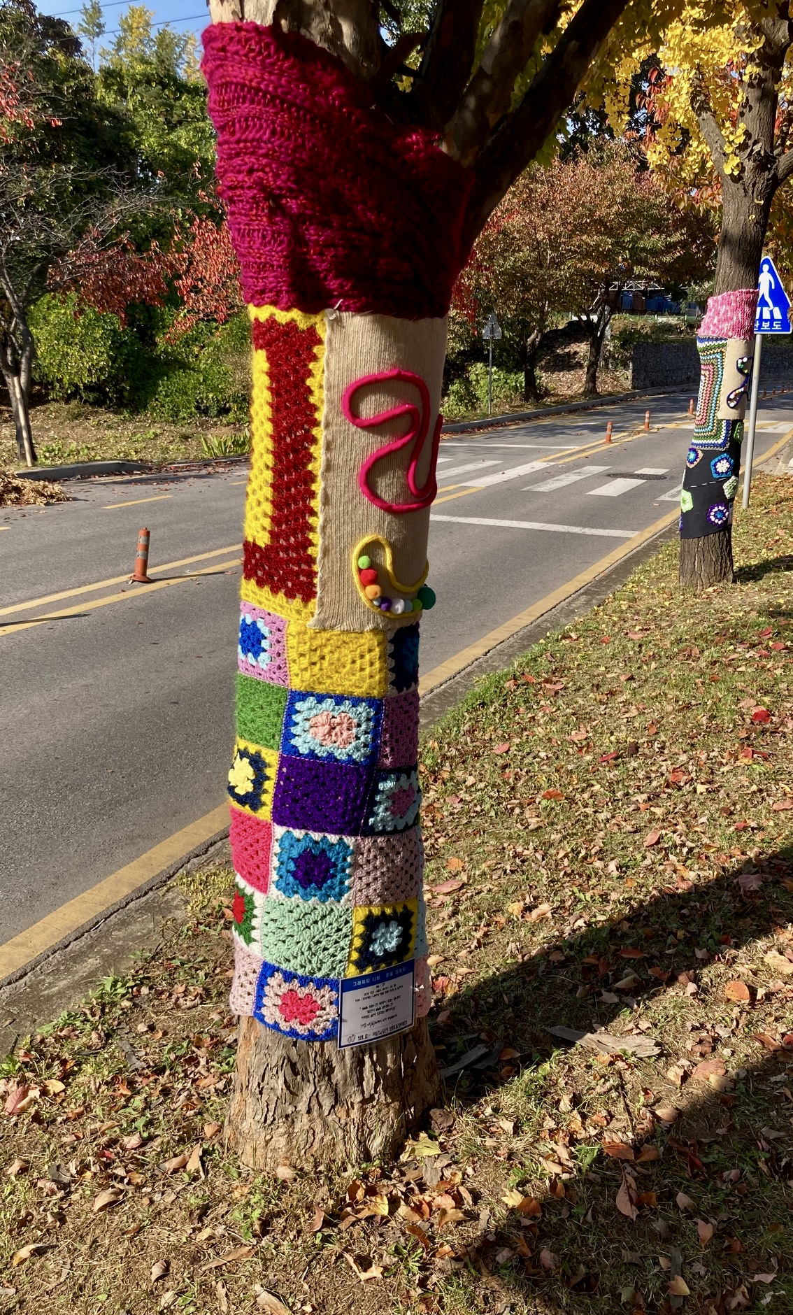 얼마 전에 차를 타고 올림픽도로에 접어드려는데, 길가에 있는 나무들에 형형색색의 털로 짠 뜨개옷이 입혀 있었다. 한겨울도 아니고, 한두 그루도 아닌데, 다양한 뜨개옷이 입혀진 나무들이 도열해 있는 게 마냥 신기했다. 운전하면서 사진을 찍을 수 없어, 며칠 뒤 산책길에 찾았다.