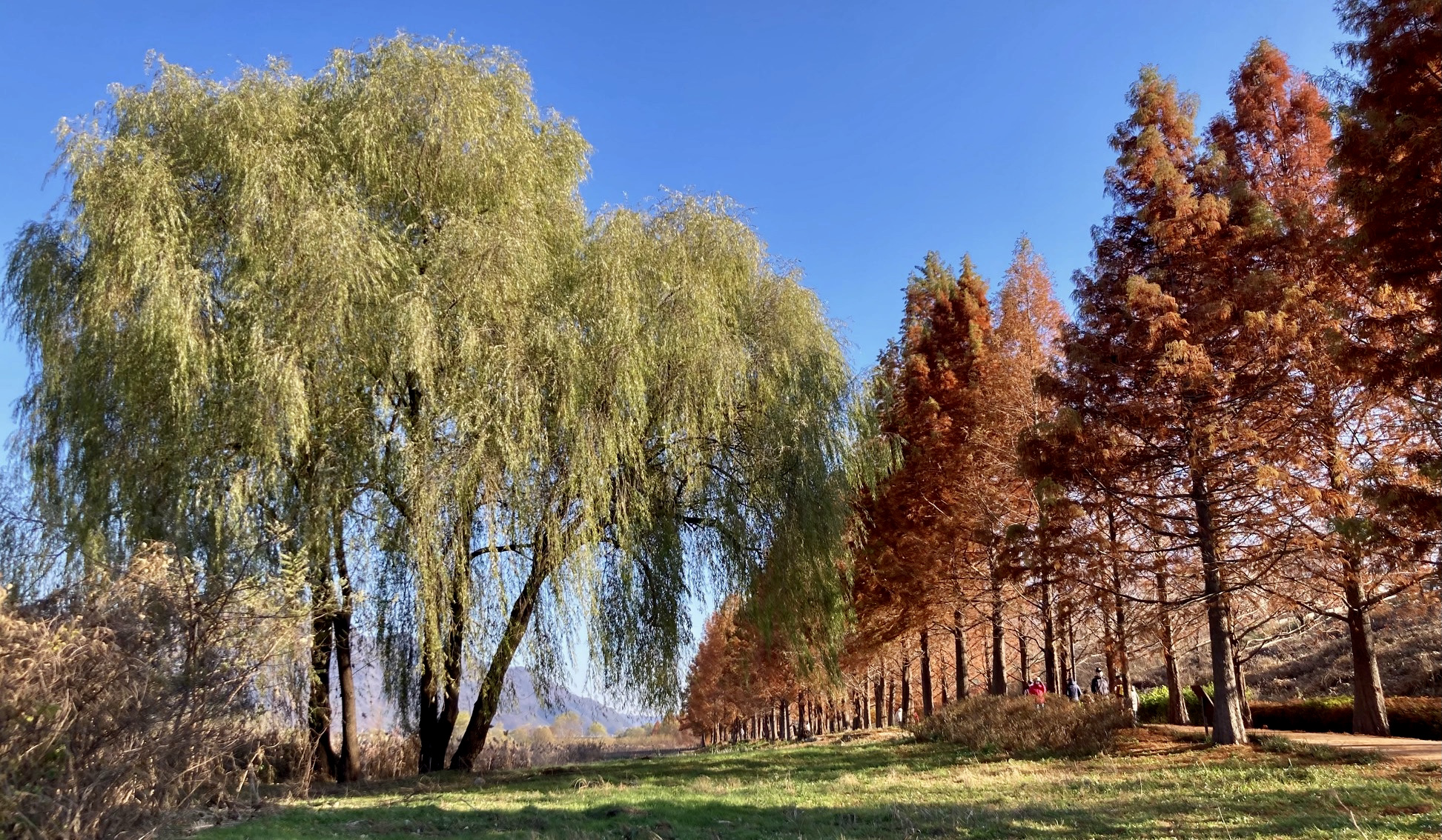 가을이 끝나가면서 메타세콰이어길도 진한 갈색으로 물들었다. 그 옆 사철 푸르른 버드나무의 푸르름과는 완연한 대조를 이루고 있다. 양쪽으로 도열한 이 거대한 나무 밑을 걷다 보면 늘 포근하게 감싸이는 느낌을 받는데, 조금 더 지나 하늘을 가렸던 이파리들이 다 떨어지면 군데군데 까치집(2/6/21)도 드러낼 것이다.