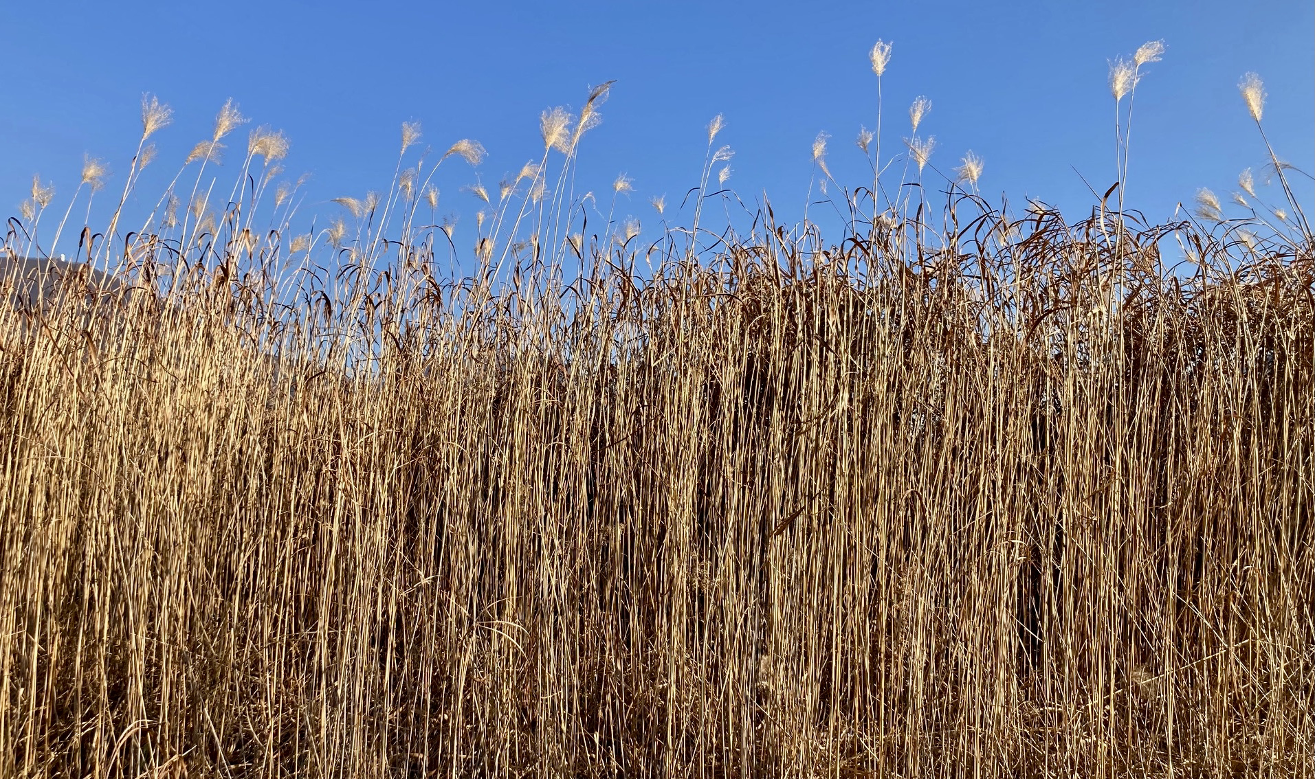 한강변 산책로엔 억새밭이 무성한데, 위에선 바람에 나풀거리지만, 아랫쪽은 촘촘하고 빽빽하게 자라면서 메타세콰이어와는 또 다른 산성을 이루고 있다. 이 억새들도 한겨울이 되면 빛을 잃어버리고 왜소해지곤 한다. 가을과 겨울, 계절의 경계선을 이루는 요즘 같은 때 만끽할 수 있는 풍경이다.