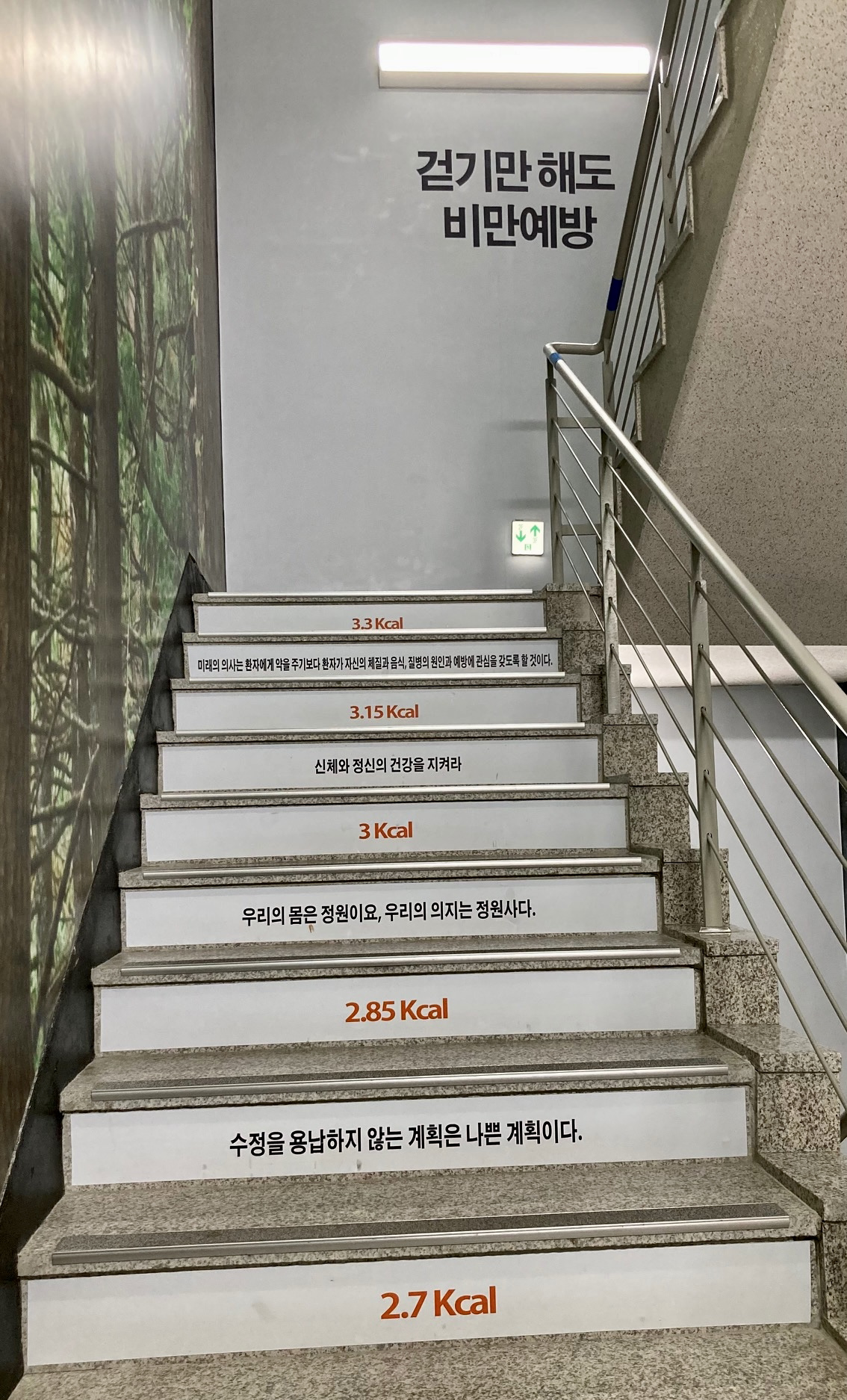 등기부 뗄 일이 생겨 법원 등기소에 갔다가 계단 벽면에 <칼로리 건강계단>이란 재밌는(?) 그림과 문구들을 접했다. 1층에서 3층까지 계단마다 걸음이 주는 유익과 줄어드는 칼로리를 표시해 놓았다. 걷기만 해도 비만을 예방할 수 있고, 한 계단 오를 때마다 수명은 4초 늘어나고, 0.15 칼로리 빠지면서, 무릎 관절도 튼든해진다는 문구가 솔깃했다.