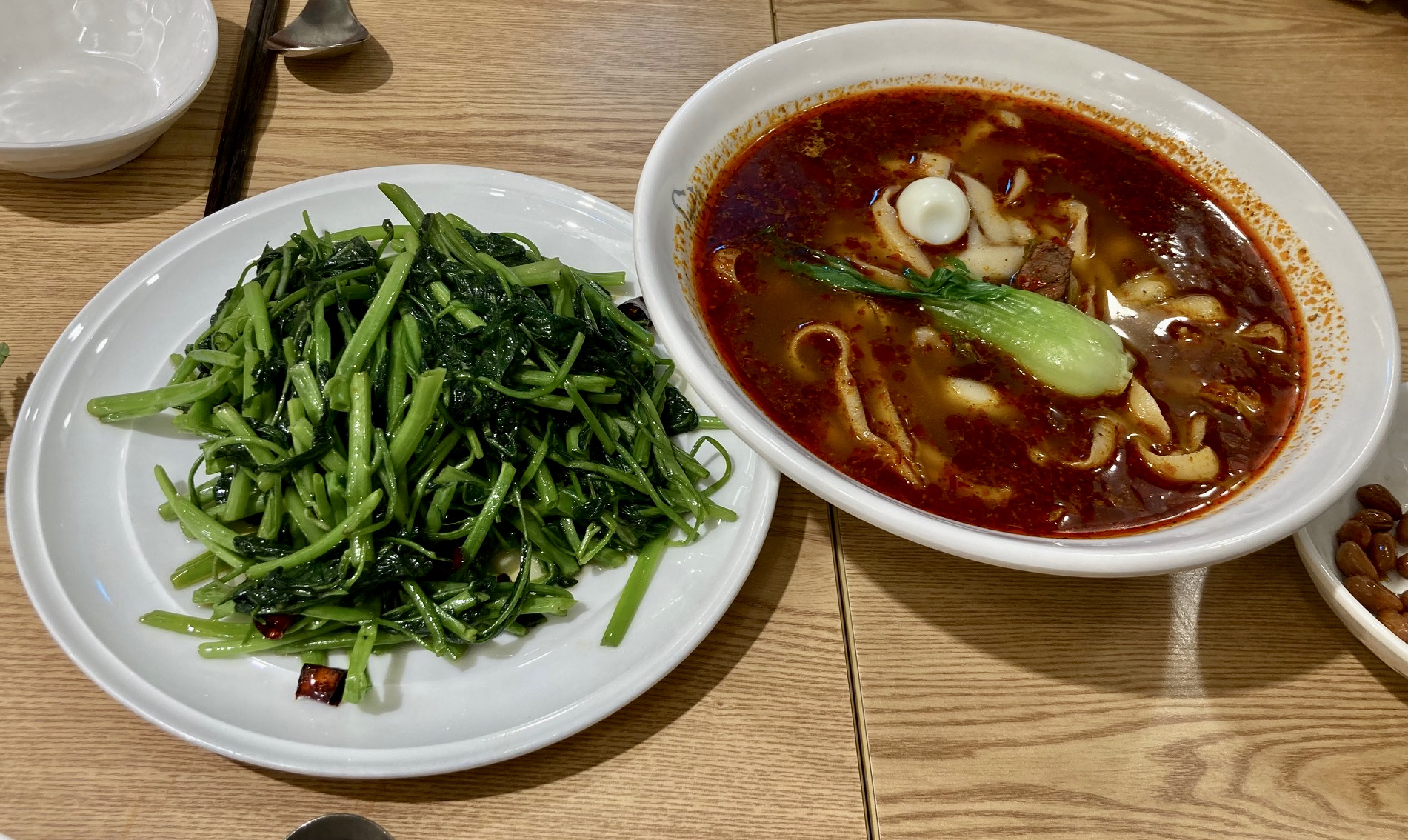 이 집의 시그니처 메뉴는 식당 이름에도 있는 도삭면이다. 두꺼운 반죽을 도마째 팔에 끼고 빠르게 칼로 썰어내 끓는 솥으로 떨어뜨리는 퍼포먼스 만큼 맛있다. 살짝 간만 해서 푸짐하게 나오는 공심채(모닝 글로리) 볶음도 안 시킬 수 없다.