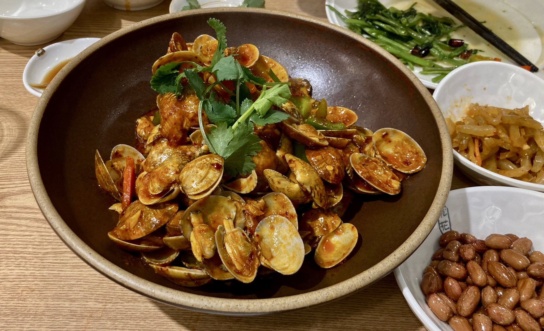 맨날 먹던 것에 매운 바지락볶음을 추가했다. 바지락 알이 작은 것만 빼곤 모두를 만족시키는 시크릿 메뉴였다. 적당히 매콤하고 짭짤한 게 도저히 칭다오를 부를 수밖에 없는데, 운전해야 하는 나는 땅콩 한 접시 더 갖다 먹는 것으로 충분했다.