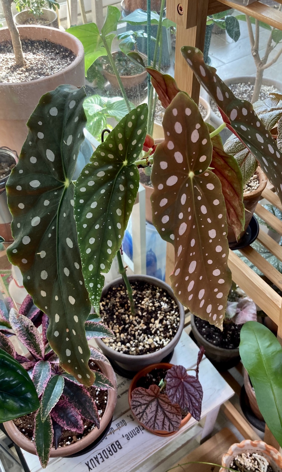 여러 화초들 가운데 이날 내 눈을 잡아끈 건 아래로 길쭉한 점박이 마큘라타 베고니아였는데, 햇빛을 받는 시간대에 따라 잎 색깔이 달라보이는 게 꽤 인상적이었다. 점심 먹을 때만 해도 완전 투 톤 컬러를 이루던 게 오후엔 다시 한 색이 돼 전혀 다른 화초인 줄 알았다.