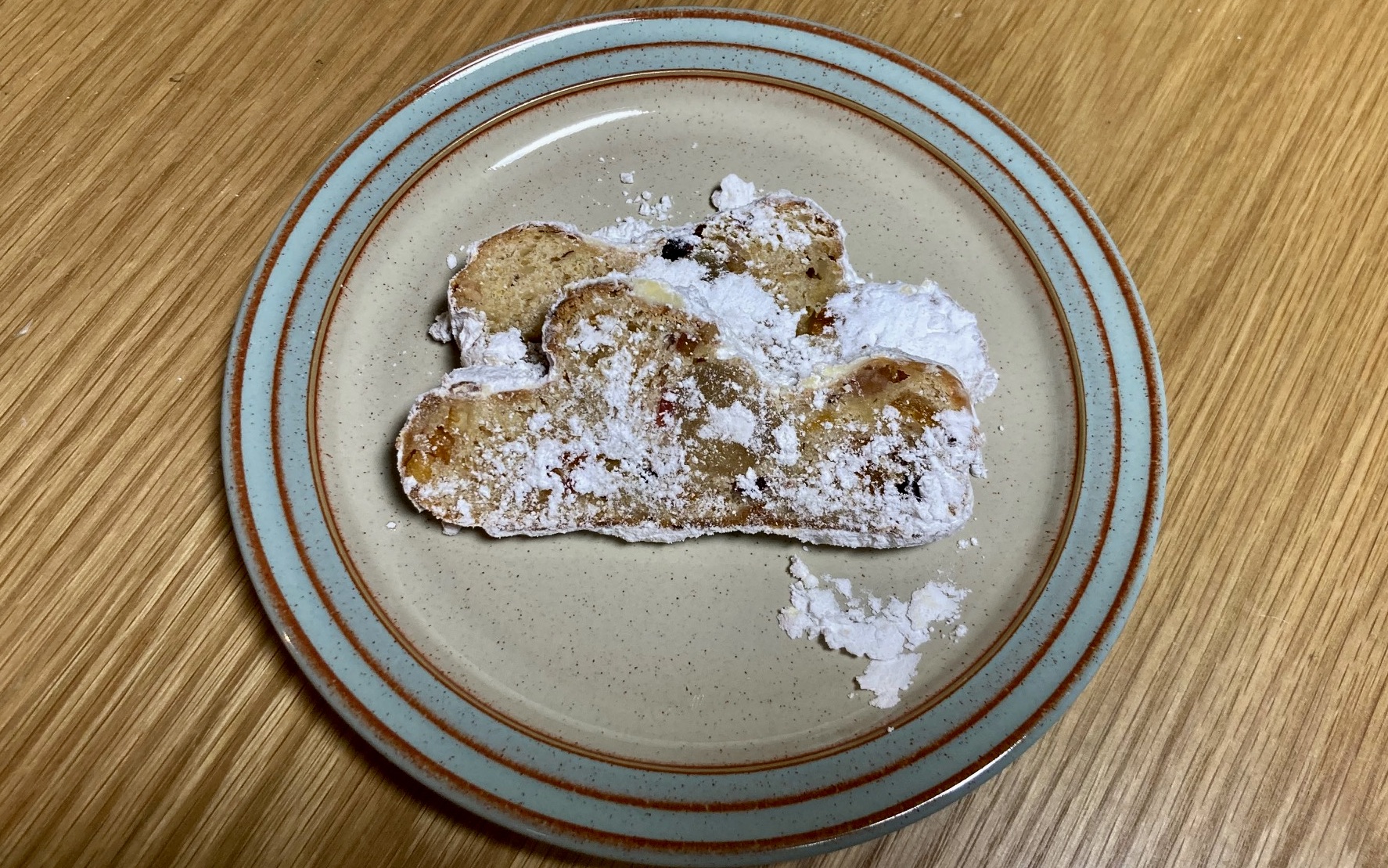 이메일로 종이 카드가, 저작권 문제로 거리의 캐롤이 사라지고, 작년부터는 성탄예배도 온라인으로 드리는 대체로 조용하고 심심한 크리스마스 시즌을 보내고 있다. 그래도 크리스마스빵 스톨렌(12/25/20)은 미리 사 두는데, g가 성수에 나갔다가 한 덩어리 사 왔다.