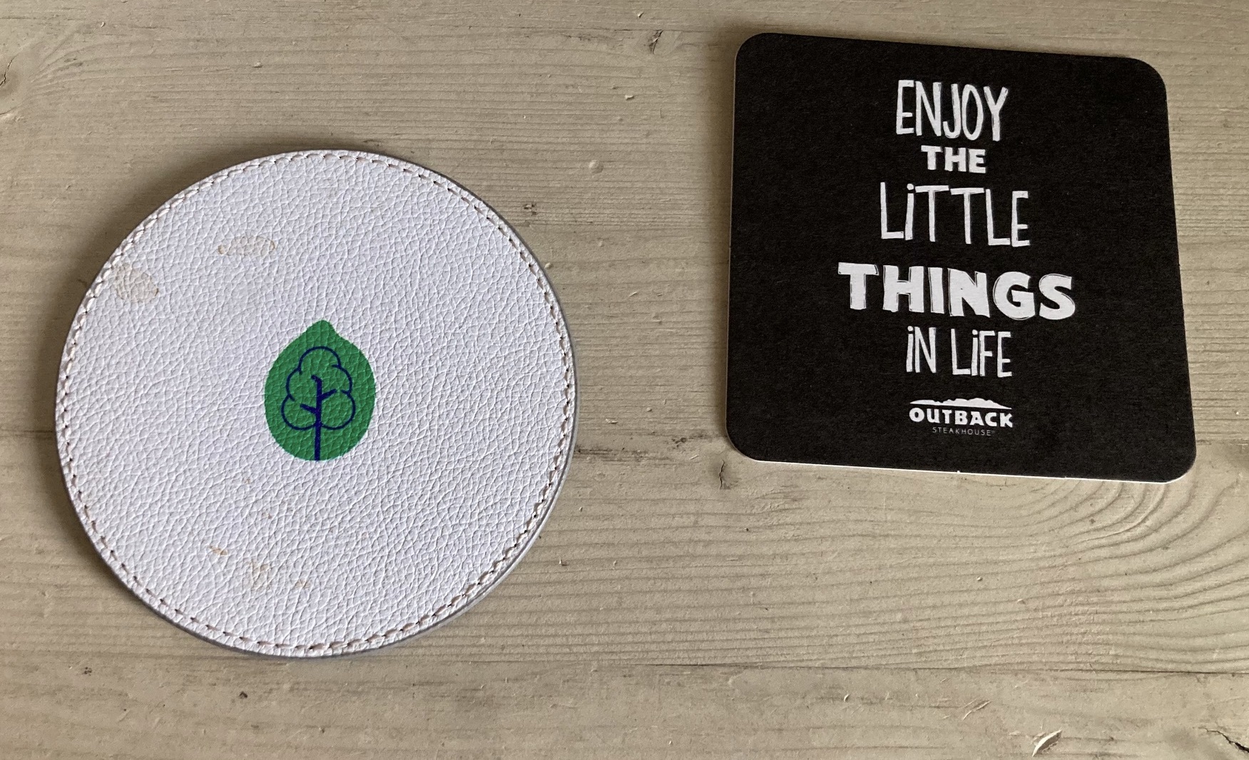 마음 연구를 하는 교회 후배에게선 양면 색이 다른 가죽 재질의 동그란 컵받침을 받았다. 가운데에 나뭇잎이 그려 있는데, 마음의 늘푸른 평안을 기원하는 건지 모르겠다. 아내 통장에서 나가 아내가 잘 쓰고 있고,^^ 나는 타이포가 이뻐 아웃백에서 가져 온 종이 코스터를 쓰고 있다.
