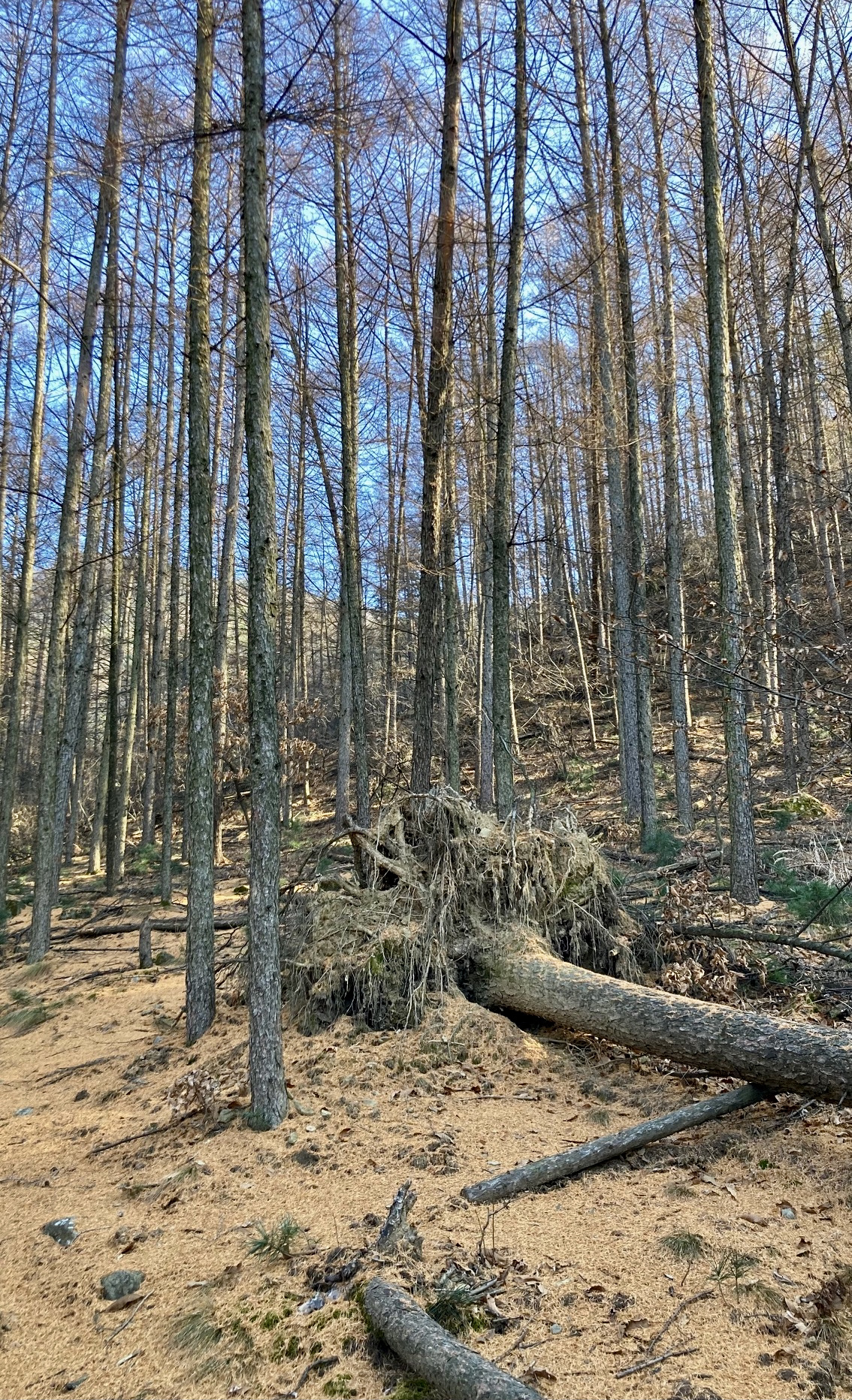 대개 자라면서 너무 빽빽하게 심겨 서로의 성장을 방해하는 것 같을 땐 밑둥을 자르기도 하지만, 이렇게 뿌리째 뽑혀 있는 나무들은 소나무 재선충 같은 병충해를 입어 그냥 두었다간 근처에 있는 나무들까지 전염시킬까 봐 아예 뿌리째 뽑는 게 아닐까 추측된다. 뽑힌 걸 왜 그냥 두는지까진 모르겠다.