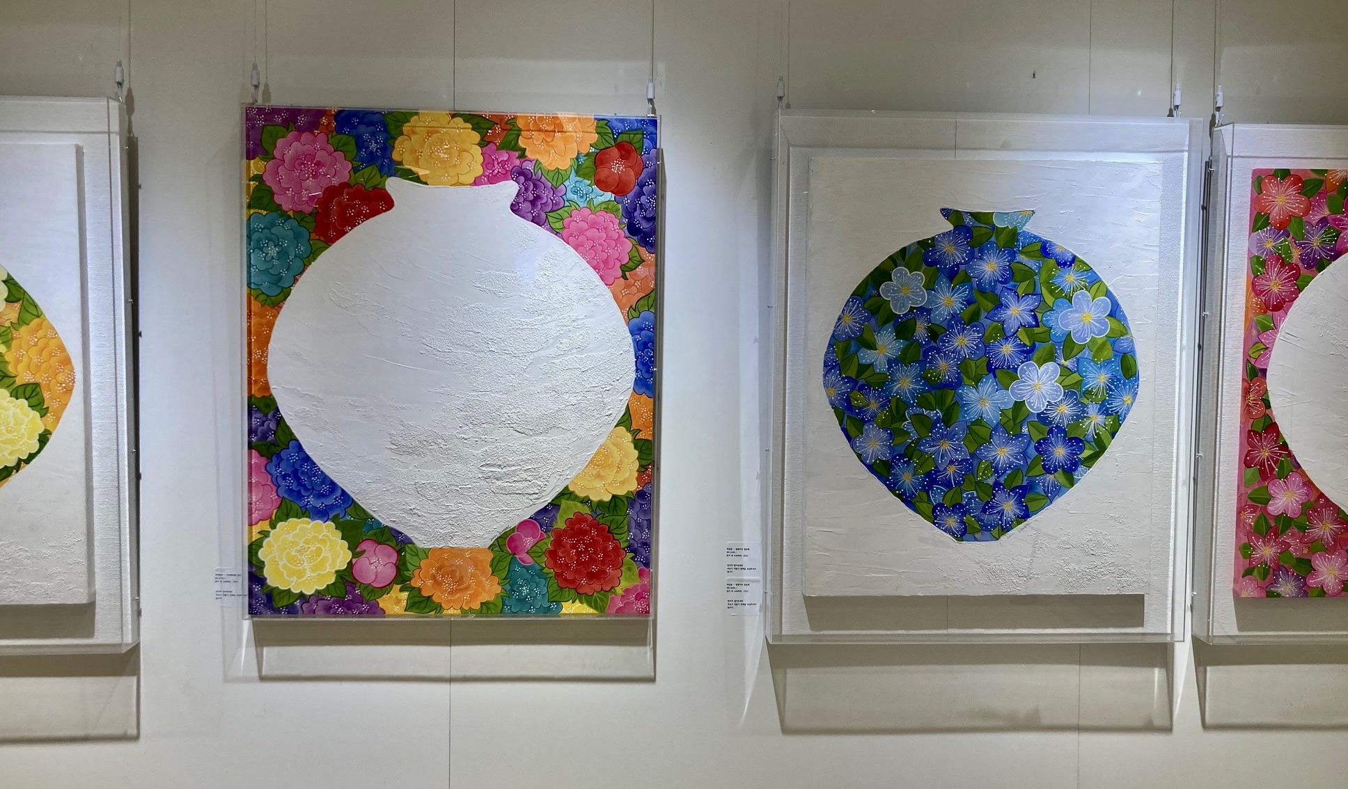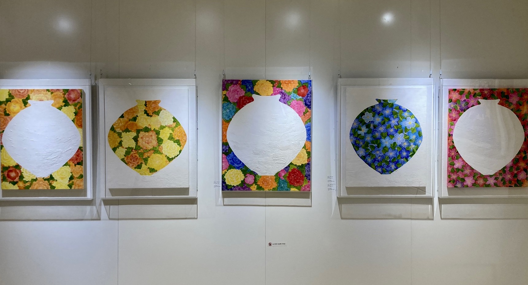 스타필드 지하1층엔 작은 미술관(5/25/21)이 있는데, 주차하고 매장에 올라가기 전에 눈길을 끌면 잠시 감상할 때가 있다. 지난주엔 한쪽 벽에 5개의 작품을 연이어 걸어 놓았는데, 둥근 항아리 화병을 중심으로 다양한 컬러의 꽃이 그려 있었다.