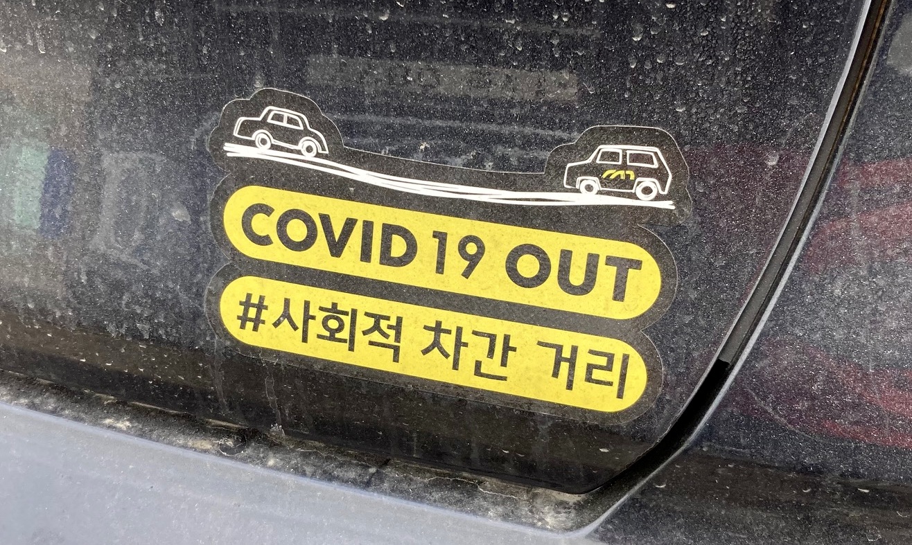 지난주말 검단산을 올라가는데, 현충탑까지 노변 주차장이 빈틈이 없었다. 그 중에서 트렁크 우측 하단에 코로나 19 아웃을 기원하며 사회적 거리두기를 패러디한 '사회적 차간 거리' 스티커가 글과 그림으로 붙어 있는 차가 눈길을 끌었다.