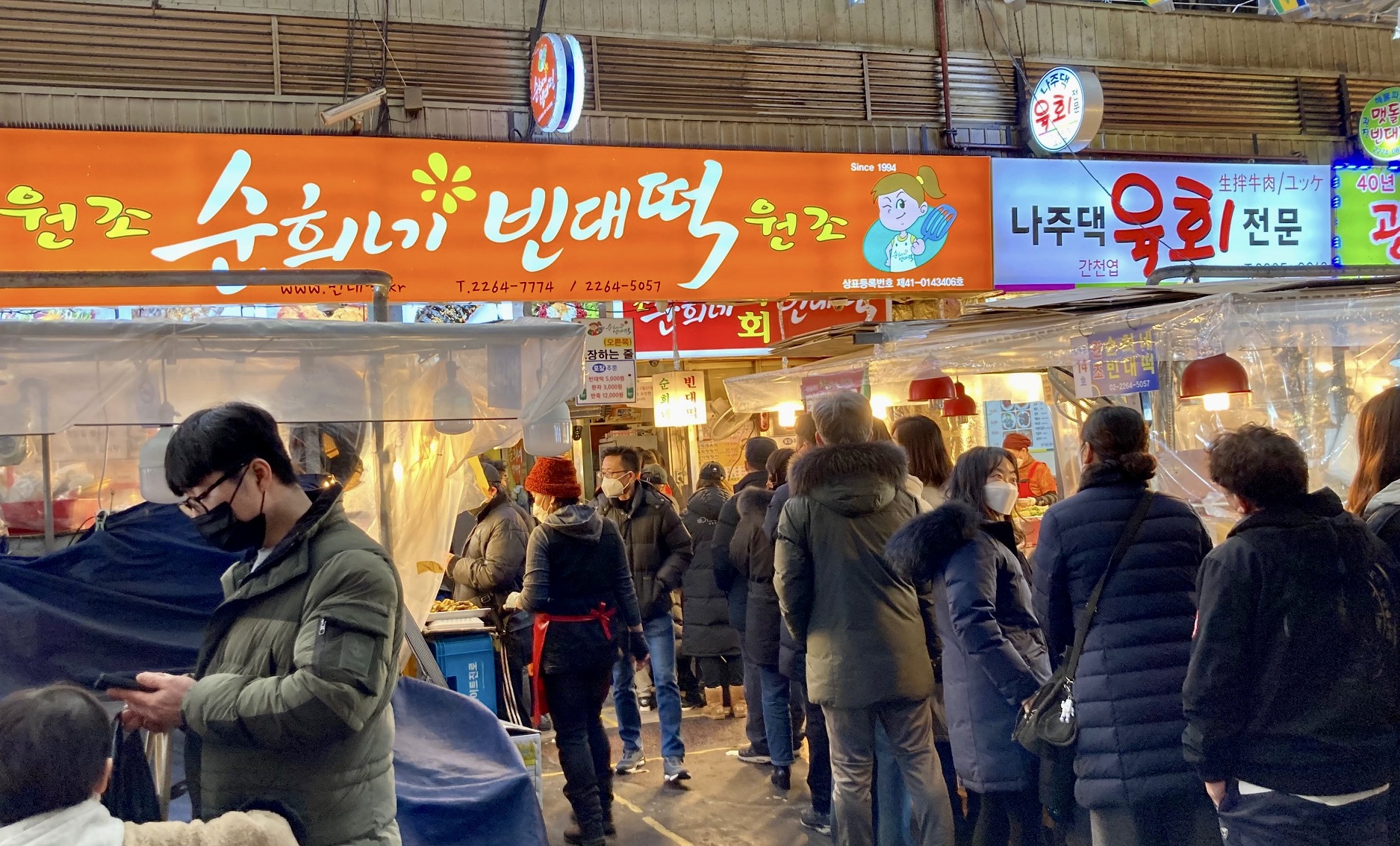 시장 대부분의 상점은 문을 닫았지만, 먹자골목은 대목으로 문전성시를 이뤄, 떠밀리듯 걸어야 했다. 유명세를 누리는 원조집들은 빈자리 없이 대기행렬이 길지만, 다닥다닥 붙은 리어카에 김이 모락모락나고 먹음직한 음식 잔뜩 쌓아놓고 의자 몇 개로 손님을 부르는 노점들도 분주하긴 매한가지였다.