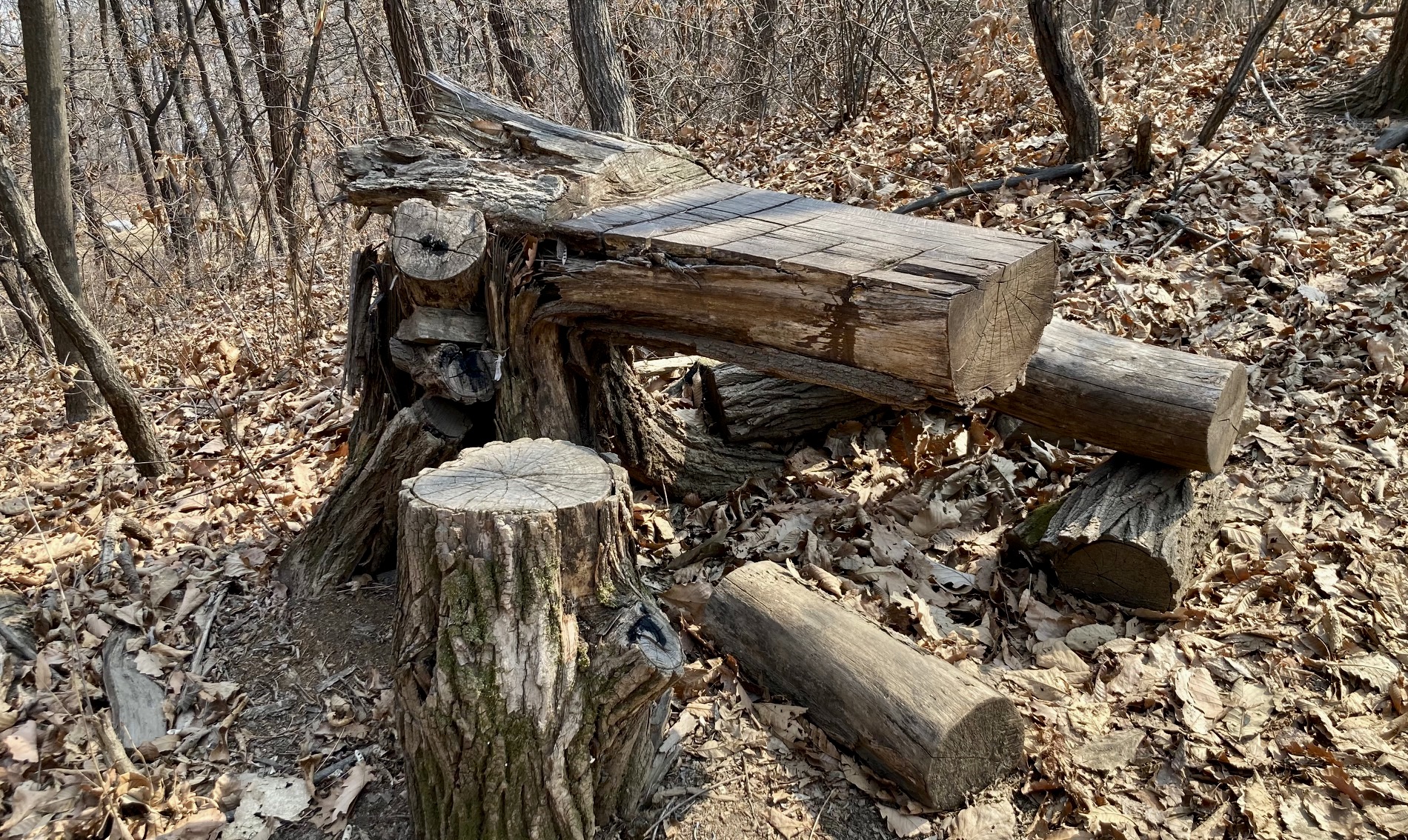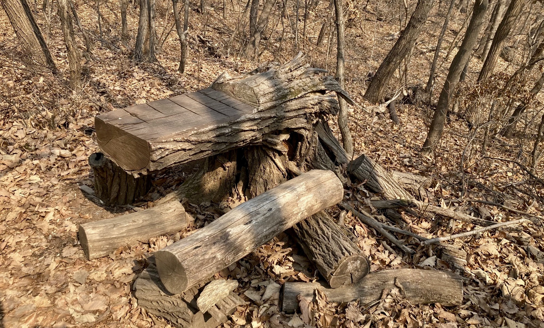 덕풍산 둘레길을 걷다 보면 눈에 띄는 테이블 의자가 있다. 의자야 통나무를 적당한 높이와 길이로 잘라 세우거나 눕힌 평범한 모양새지만, 테이블 생김새가 범상치 않다.