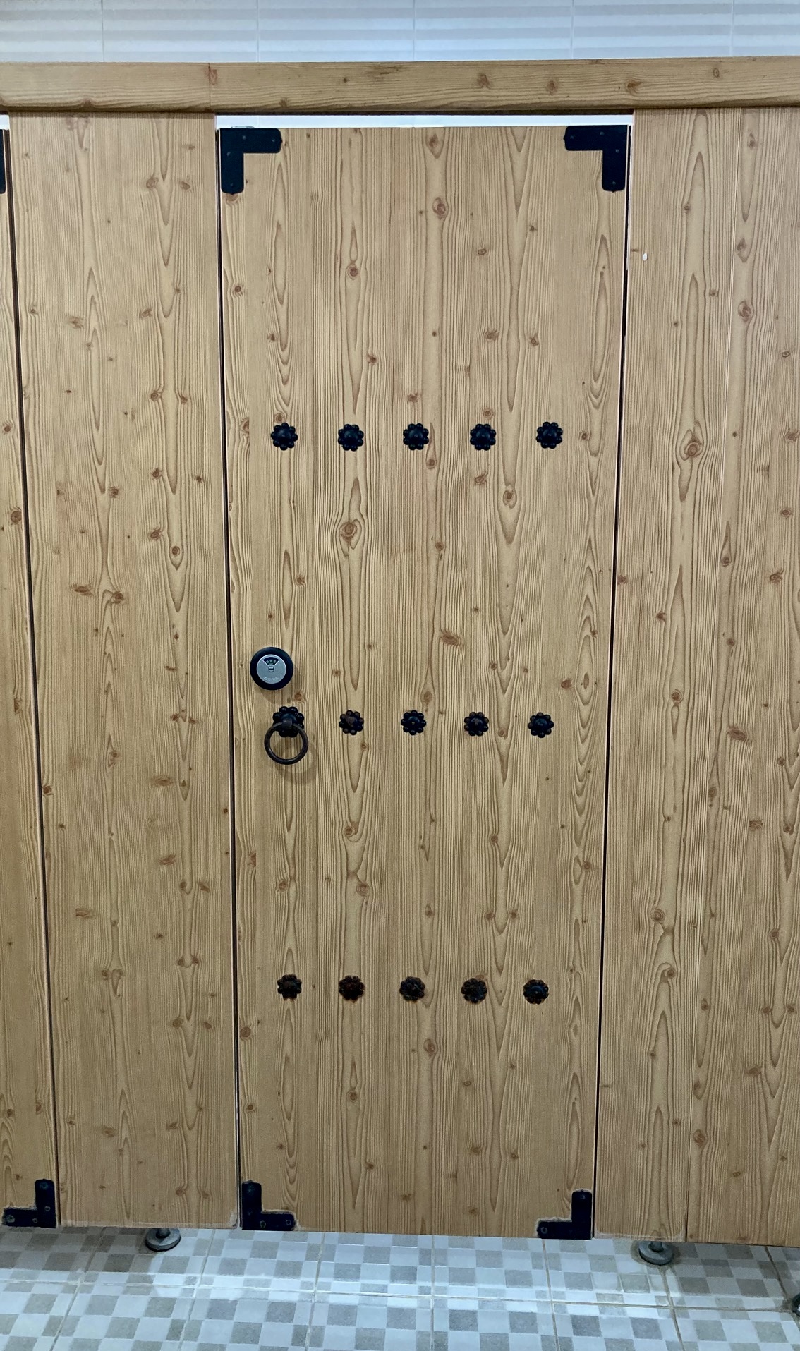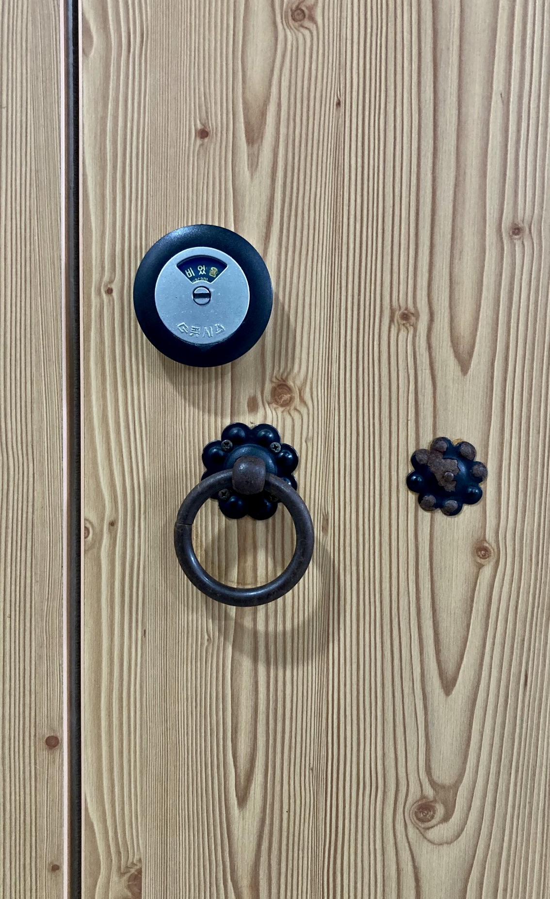 외관도 그럴싸 했지만 내부도 볼만 했는데, 전체적으로 말끔하게 나뭇결을 살리고 네 귀퉁이 마감과 다섯 개씩 세 줄의 중간 장식들이 화장실 문짝치곤 실짝 생뚱맞게 품위 있어 보였다. 이 문짝의 화룡점정은 바깥 손잡이였는데, 당겼다 밀었다 하면서 노크를 대신할 수 있게 해 놓은 게 제법 신경쓴 것 같았다. 물론 "이리 오너라!" 대신, "냉큼 나오너라!"겠지만.^^