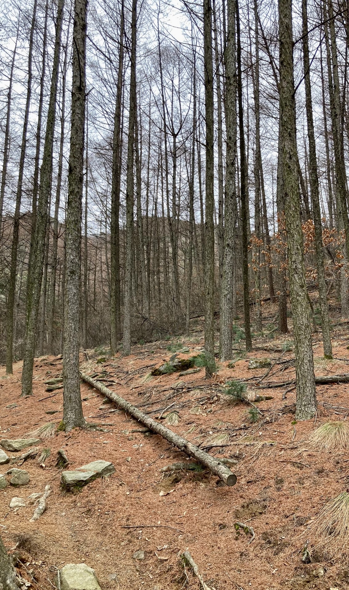 원래 이름은 일본잎갈나무인데, 백여 년 전 일제 강점기 때 들어와 자리 잡았다고 한다. 워낙 많이 떨어지고 두텁게 쌓인 낙엽은 겨울을 지나 봄 여름까지 밋밋한 산을 갈색으로 채색해 보는 즐거움도 선사한다.