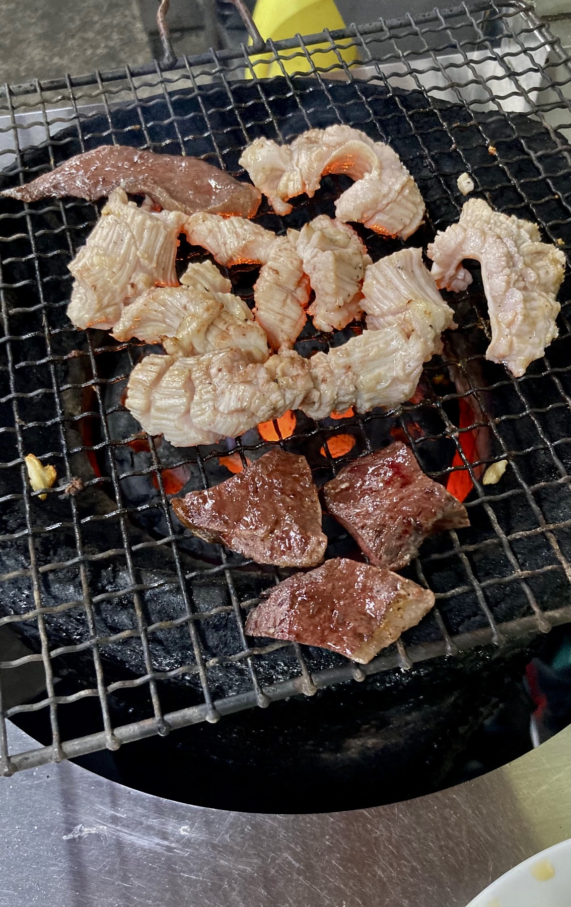 양과 곱창, 염통이 나오는 모둠으로 소금구이와 양념구이를 하나씩 시키고, 부산 소주인 대선 소주도 예의상 한 병 시켰다. 연탄불판 위 석쇠에서 적당히 구워지면 마늘간장소스에 찍어 먹는데, 꼬소하고 쫄깃한 게 식도락 천국이 따로 없다. 양념구이는 비주얼에 비해 딱히 매운 맛은 아닌데, 우린 둘 다 소금구이에 엄지 척 했다.