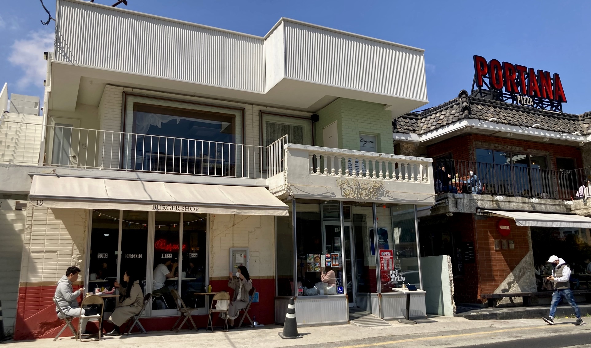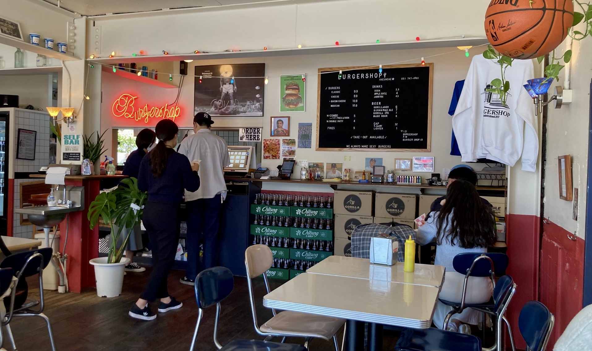 해운대역에서 내려 백사장 가는 반대편으로 조금 걸으면 수제 버거 잘하는 집이 나온다. 30분쯤 기다렸다가 들어갔는데, 안팎 분위기가 영락없는 미국 시골 동네 버거집이다. 버거샵(Burgershop)이란 식당 이름이며, 영업 시간 안내판, 메뉴판 스타일도 영락없는 미국식이다.
